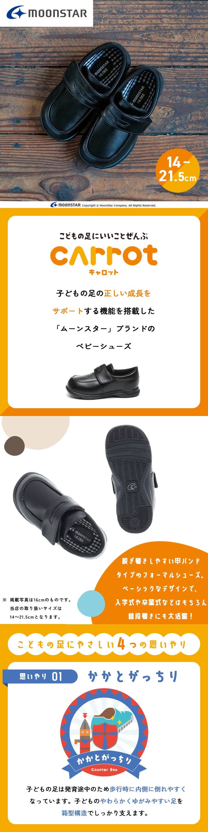 | 【CARROT キャロット C2092】 足の成長を考えた機能性子ども靴「ムーンスターキャロット」のフォーマルシューズです。 脱ぎ履きしやすい甲バンドタイプです。 コインローファータイプのベーシックなデザインで普段履きにも使えます。 子どもの足の成長をサポートする4つの機能(つま先ゆったり/カウンターボックス/フレックスジョイント/洗えるインソール)を搭載しており、 ハーフサイズ対応でお子さまの成長に合わせたサイズ選びが可能です。重さは16.0cmで片足約105gです。 【つま先ゆったり】 つま先にゆとりを持たせた形状で、足の指を圧迫せずにのびのび動かせます。 【カウンターボックス】 子どもの柔らかくゆがみやすい足を箱型構造でしっかり支えます。 【フレックスジョイント】 足の曲がりと同じ位置で靴が曲がる設計で、足に余計な負担をかけません。 【洗えるインソール】 足裏になじみ、取り出して洗濯ができるので靴内を清潔に保てる中敷きです。 【Ag+抗菌防臭】 銀イオンの抗菌作用でにおいのもととなる菌の増殖を抑制し、防臭効果を発揮します。天然由来成分で安全です。 【軽量設計】 軽くなるような工夫を施した設計です。 |