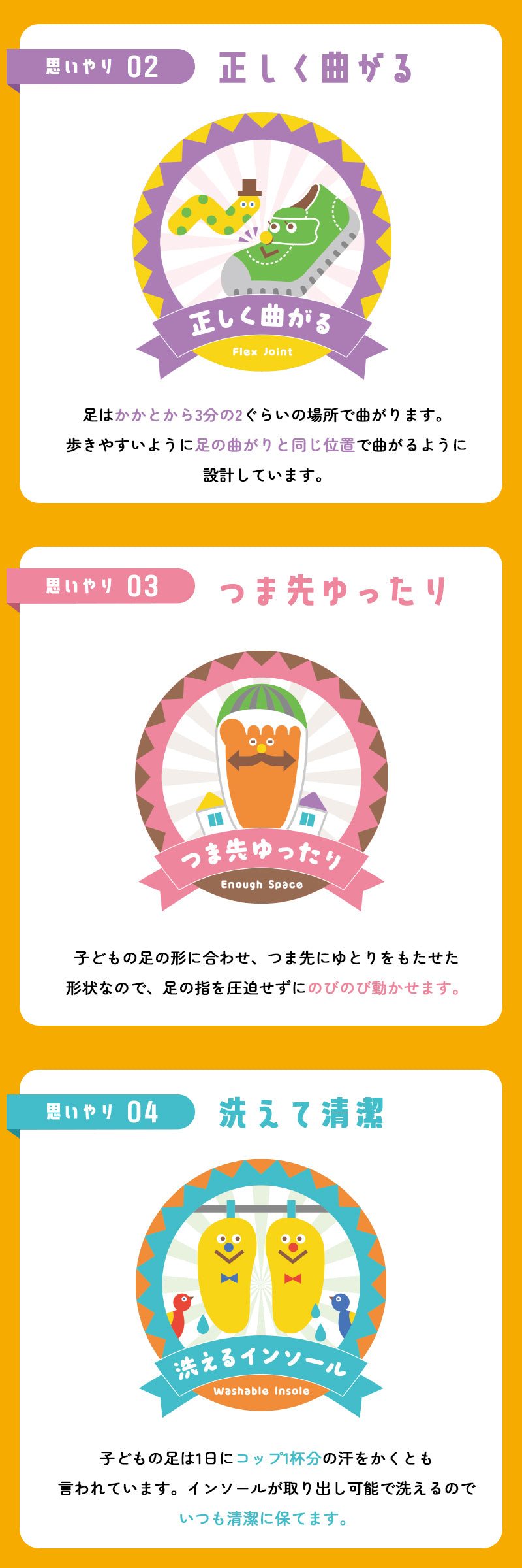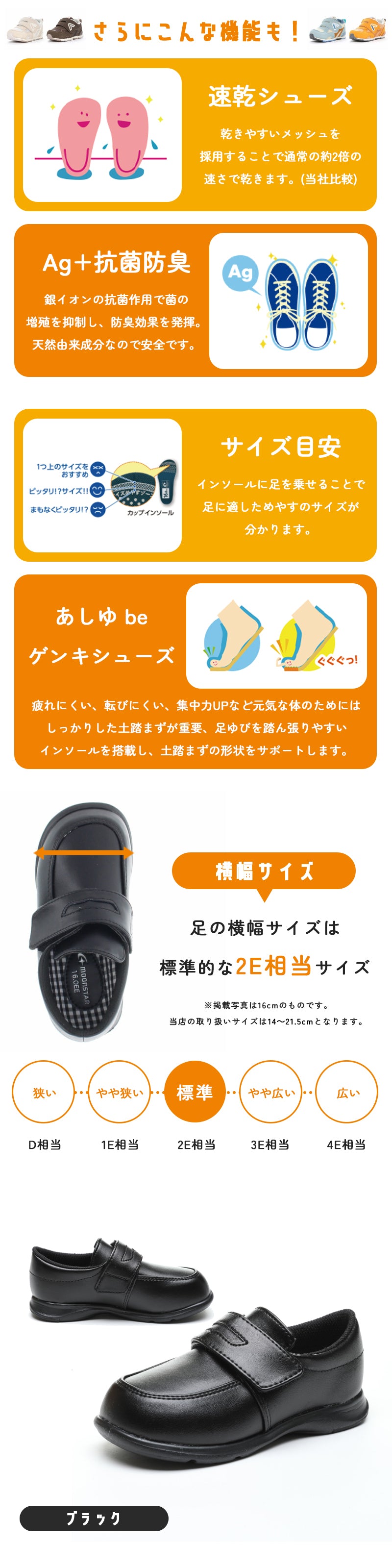 | 14.0cm-21.5cm(ハーフサイズ有り) ●足幅:2E(標準) ●重さ:片足約105g(サイズ16.0cm時) |
