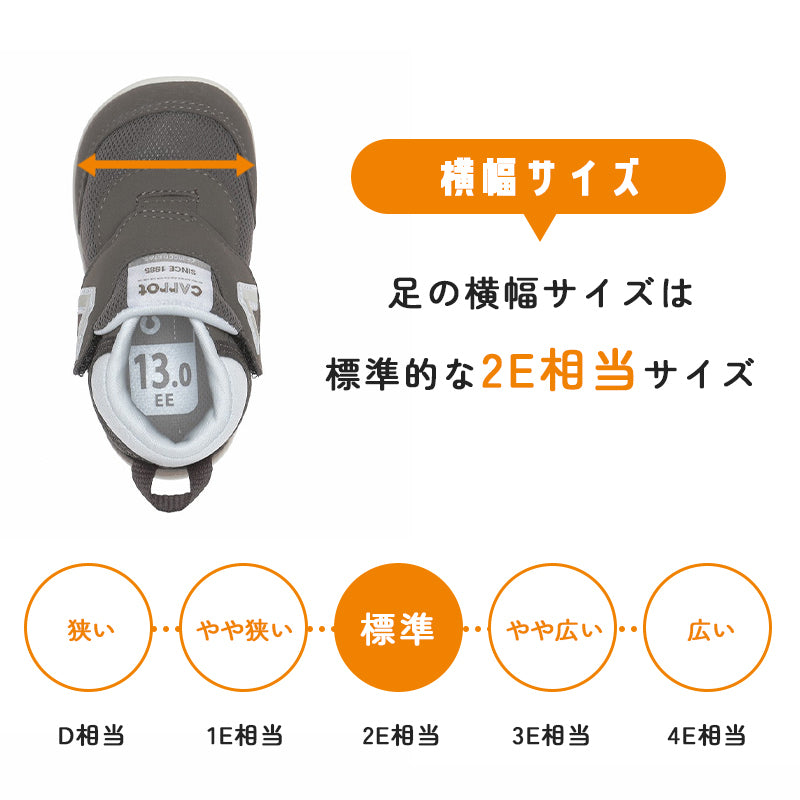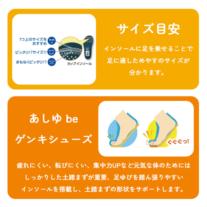 子どもの足の成長をサポートする「4つの機能(つま先ゆったり/カウンターボックス/フレックスジョイント/洗えるインソール)」により、健やかな成長を促します。