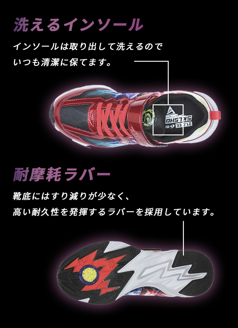 男の子の様々な潜在能力を解き放つシリーズ「スキルシューター」の「雷スキル ジンライ」です。 「スキルを解き放て」をコンセプトに子どもたちの多様化するシーンに合わせた「SKL」をアウトソールに搭載しており、踏み込む際の荷重によって「SKL」が発動します。 「雷スキル」は雷をモチーフにしたスパイク形状の「SKL」が走る際に発動し、走りをアシストします。 |