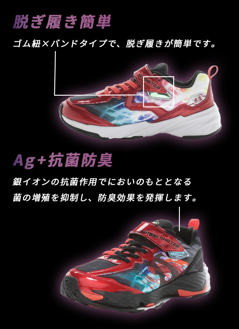 男の子の様々な潜在能力を解き放つシリーズ「スキルシューター」の「雷スキル ジンライ」です。 「スキルを解き放て」をコンセプトに子どもたちの多様化するシーンに合わせた「SKL」をアウトソールに搭載しており、踏み込む際の荷重によって「SKL」が発動します。 「雷スキル」は雷をモチーフにしたスパイク形状の「SKL」が走る際に発動し、走りをアシストします。 |