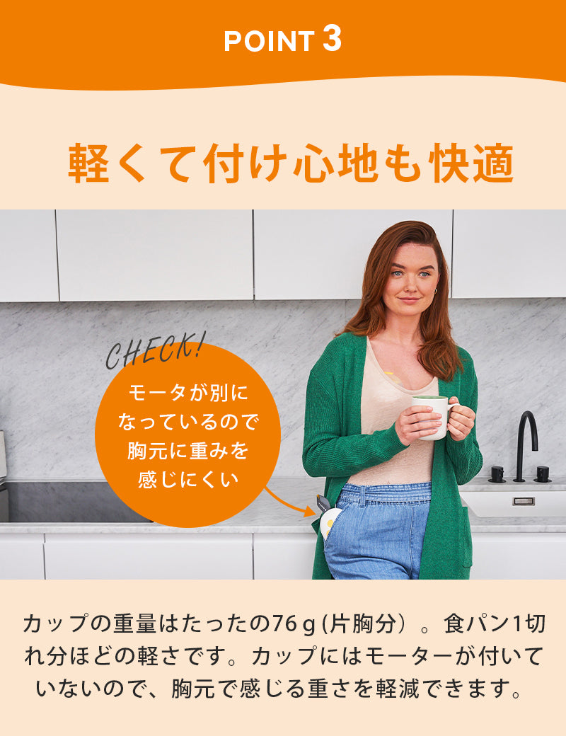 カップにはモーターが付いていないので、胸元で感じる重さを軽減できます。