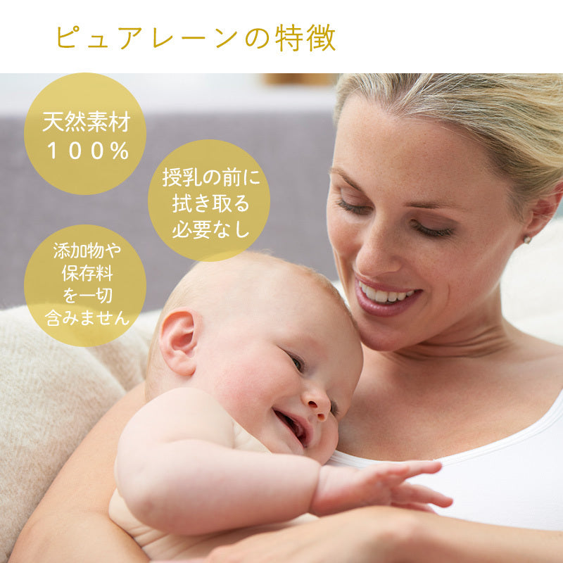 ●添加物や保存料を一切使用していません。拭き取らずにそのまま授乳できます。 ●天然ラノリン(※)100%使用で無添加・無香料。ピュアレーンは欧州薬局方(EP)および米国薬局方(USP)の必要基準を満たし、最も純粋なメディカルグレードのラノリン製クリームです。 (※)ラノリンは羊毛から抽出した羊毛脂です。優れた保湿成分が皮膚を保護し、カサツキや荒れを防ぎます。 ●赤ちゃんの乾燥したお肌に使用することもできます。 |