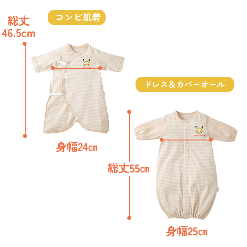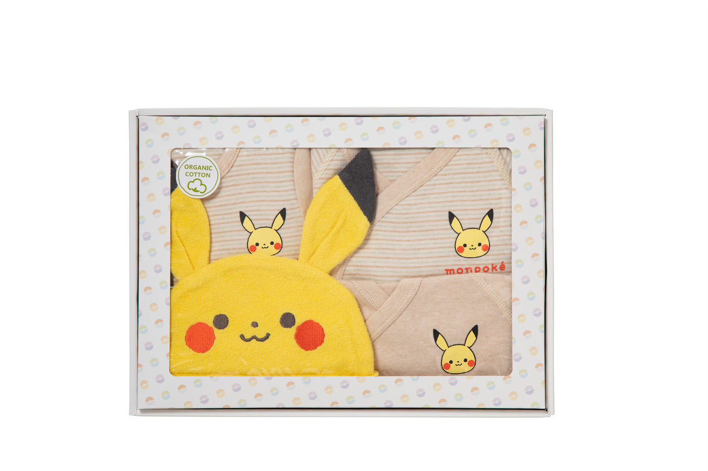 オーガニック素材の短肌着・コンビ肌着・ドレス&カバーオールとピカチュウの帽子の基本アイテムをセットにしています。