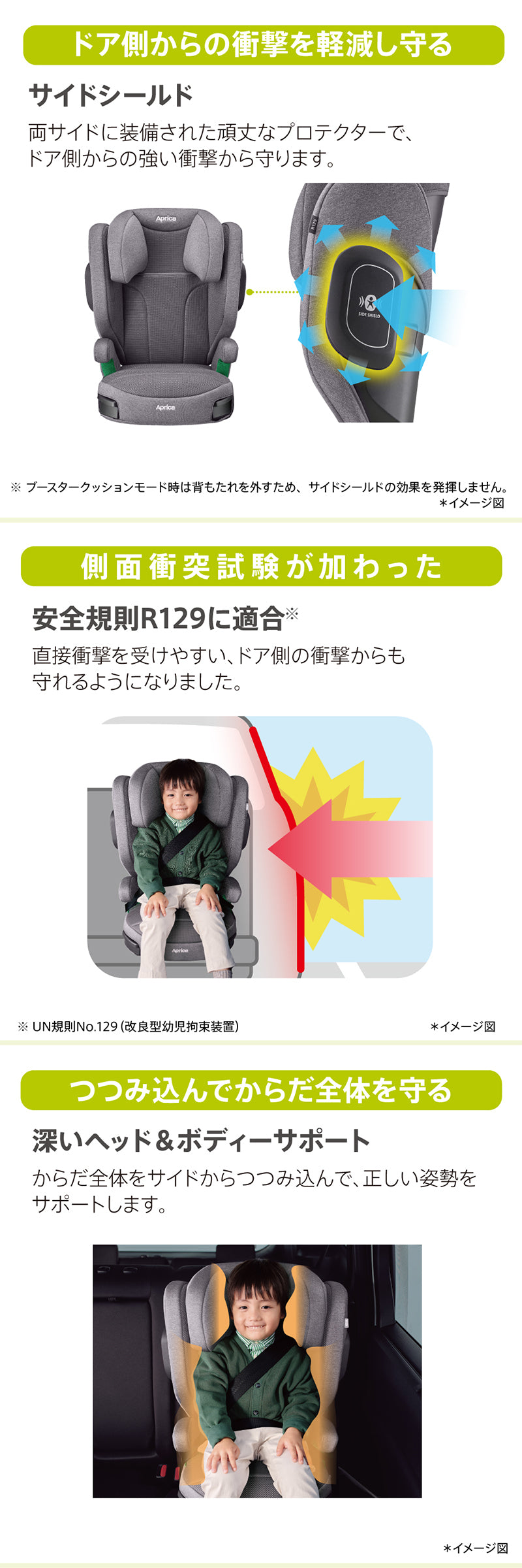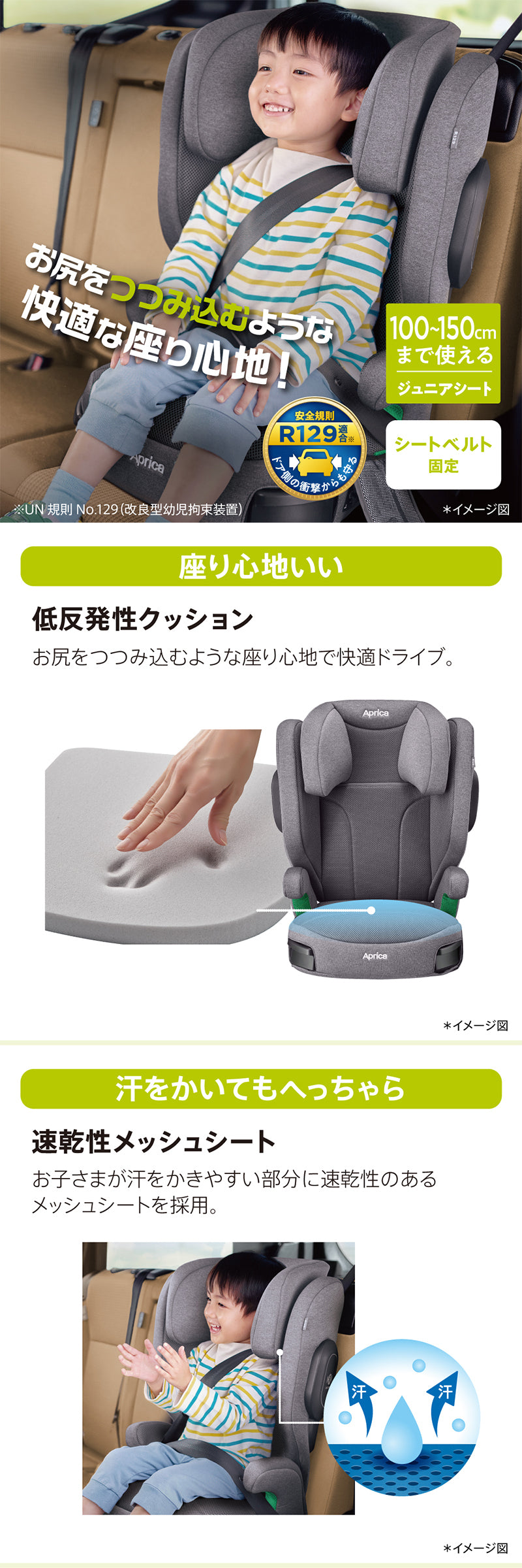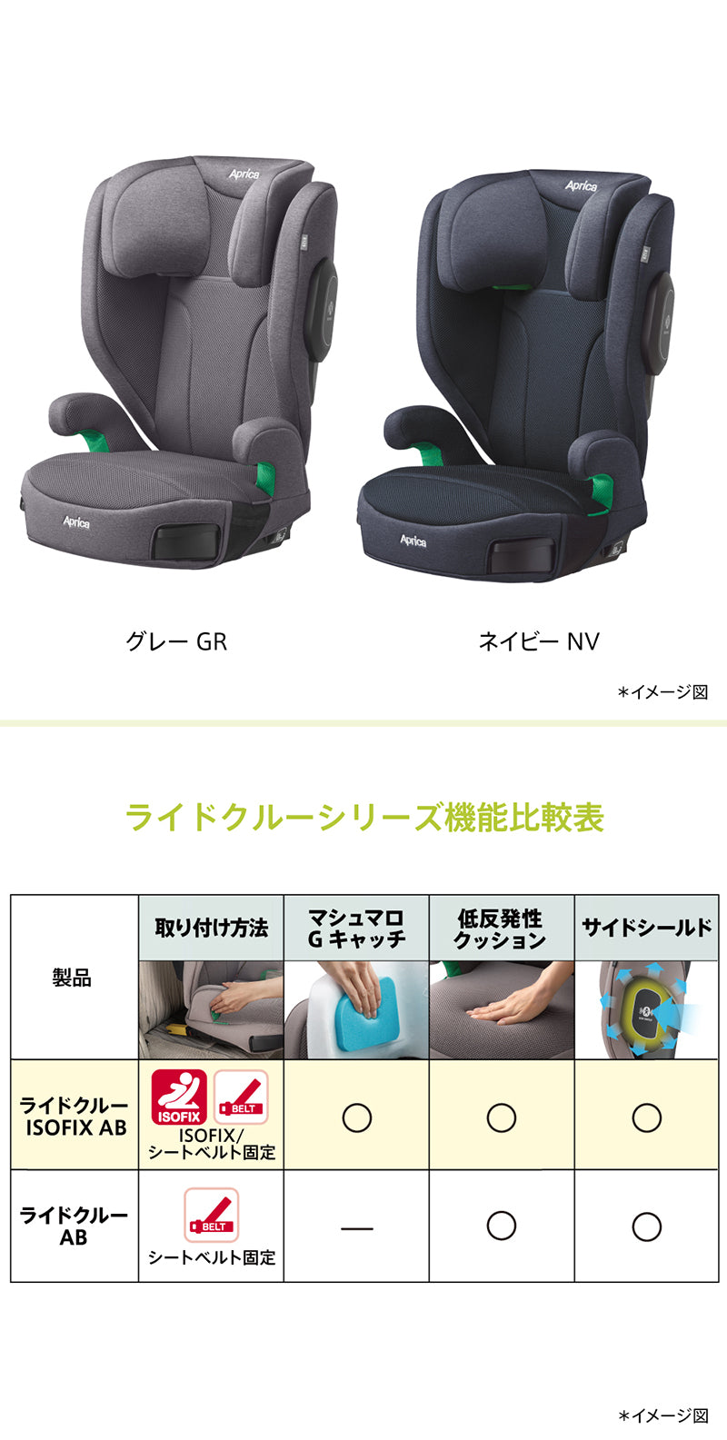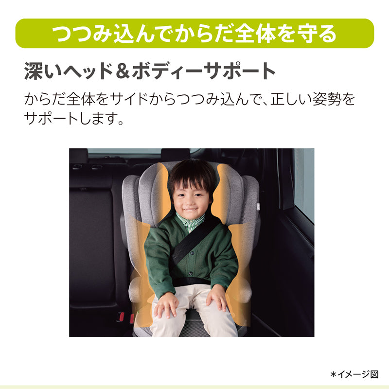 アップリカの 「ライドクルーAB」 ・身長100cmから150cmまで使えるシートベルト固定タイプのジュニアシート(※参考年齢3.5歳頃~12歳頃まで)。 ※「 2006, 2007 世界保健機構」資料より ●低反発性クッション ・お尻を包み込むような座り心地のいいクッションで快適ドライブ。 ●速乾性メッシュシート ・お子さまが汗をかきやすい部分に速乾性のあるメッシュシートを採用し、汗をかいてもへっちゃら。 ●サイドシールド ・両サイドに装備された頑丈なプロテクターで、ドア側からの強い衝撃を軽減し、からだを守ります。 ※ブースタークッションモード時は背もたれを外すため、サイドシールドの効果を発揮しません。 ●R129に適合 ※1 ・より厳しくなった安全規則で直接衝撃を受けやすい、ドア側の衝撃からも守れるようになりました。 ●深い ヘッド&ボディーサポート ・体全体をサイドから包み込んで、正しい姿勢をサポートし、守ります。 ●収納式ダブル・カップホルダー ・ドリンクやちょっとしたお菓子を置けるカップホルダーを 2つ装備。必要な時に引き出して使えるからじゃまになりません。 ●10段階ヘッドサポート ・成長に合わせてカンタンに10段階に調節できるから最適な位置で頭を守ります。 ●洗濯機で洗える ・シートカバーを簡単に取り外して洗濯機で洗えるので、いつでも清潔に。汗や食べこぼしも安心です。 ※2 ●背もたれ角度調節 ・車のシートに合わせて2段階に背もたれ角度を調節できるからシートにしっかり取り付けができます。 ●肩ベルトガイド ・成長に合わせて、シートベルトを正しい位置にカンタン調節できます。 ・身長135cmになったら、状況に合わせて2つのモードを選べます。ブースターモードでも新安全規則R129 に適合。 ・ブースターシートモード(背もたれあり):身長100cm~150cmまで ・ブースタークッションモード(背もたれなし):身長135cm~150cmまで ※1 UN規則 No.129(改良型幼児拘束装置)※2取り外し方法や洗濯方法については、取扱説明書をご確認ください。 |