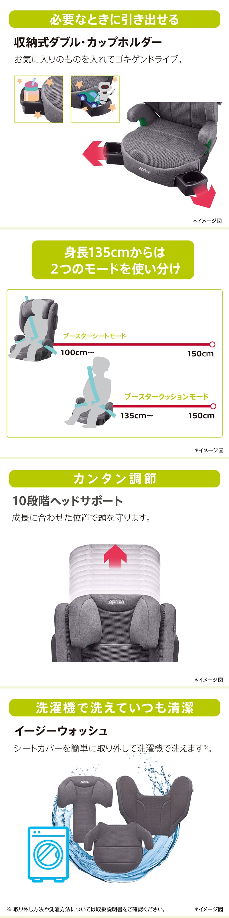 ・身長:ブースターシートモード(背もたれあり):身長100cm~150cmまで ブースタークッションモード(背もたれなし):身長135cm~150cmまで |