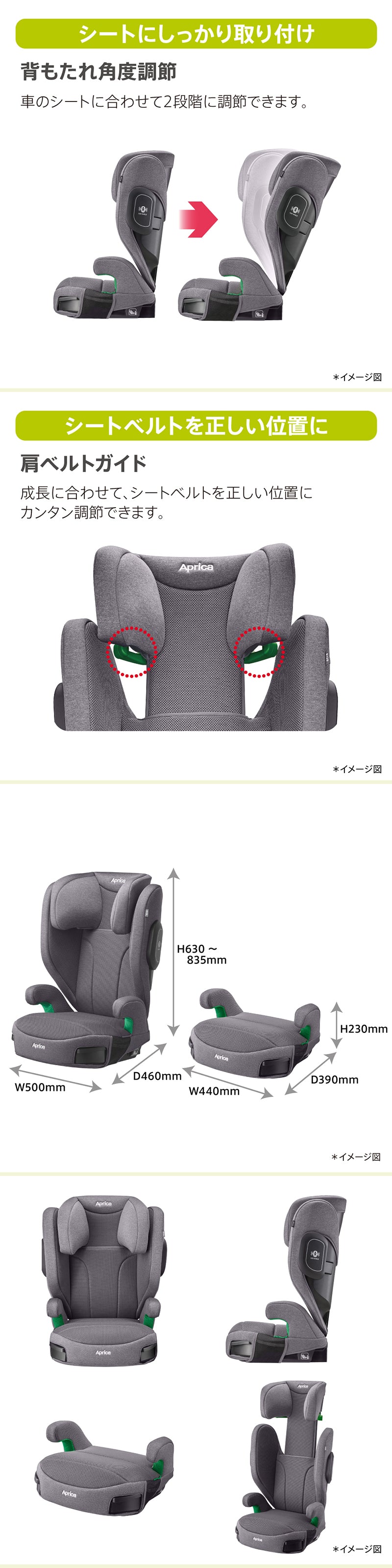 (ブースターシートモード)W500×D460×H630-835mm、4.1 kg/(ブースタークッションモード)W440×D390×H230mm、2.0 kg |