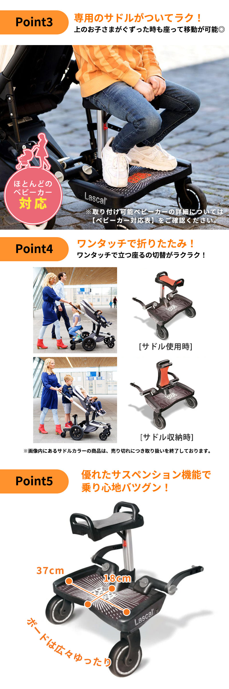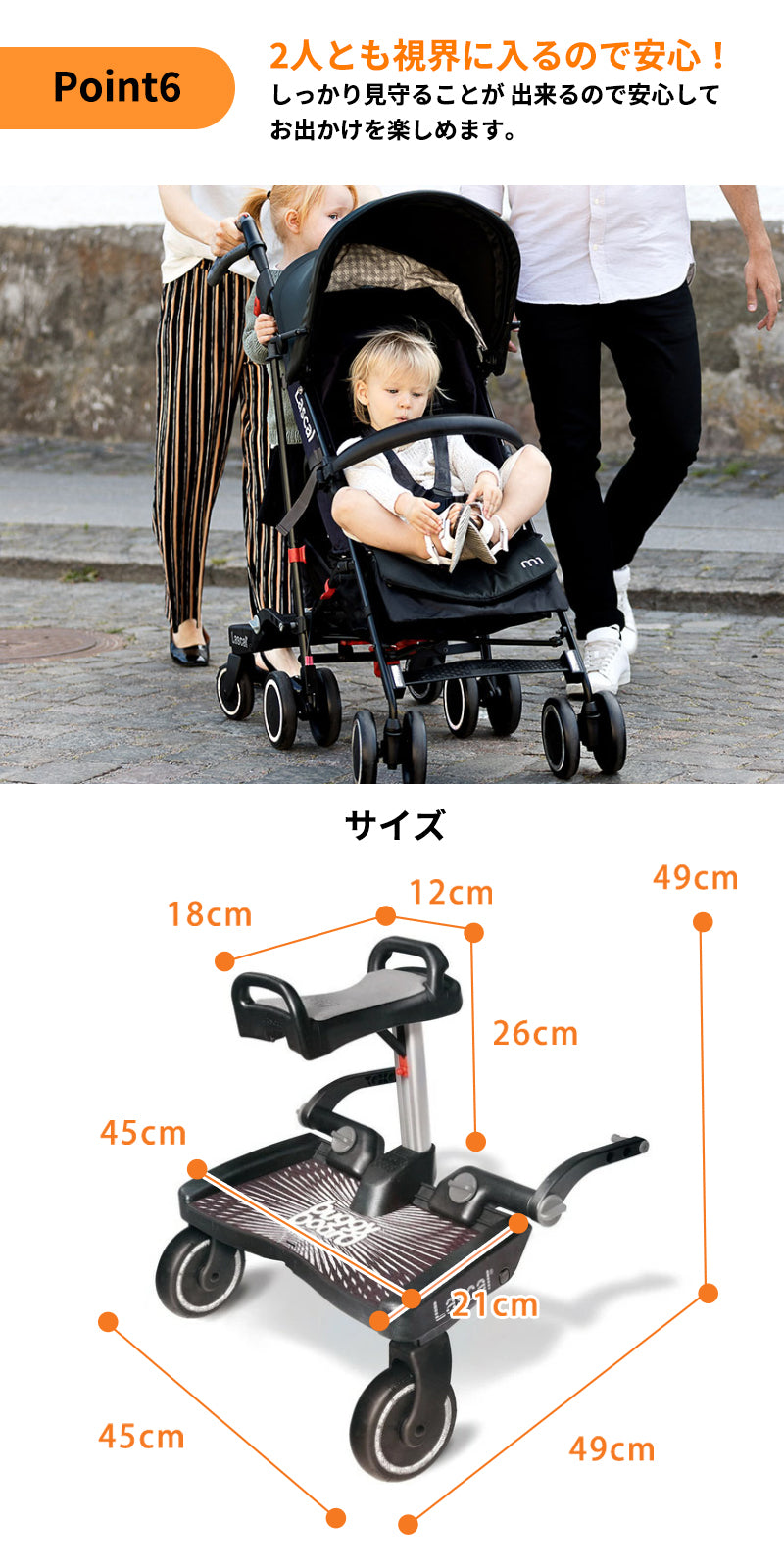 ベビーカーやバギーの後輪フレームに取り付けて、上のお子様を乗せて移動するための立席ボードと専用のサドルセットです。 ボードを使用しない時はフックで引っ掛けることができます(一部を除く)。 ※引っ掛ける際はサドルは取り外してください。 移動中は下の子はベビーカーの座席に、上の子は保護者の腕の間。二人とも視界に入り見守れるので、交通量が多い場所でも安心して移動できます。 急いで移動したい時や、お子様が疲れた時でも自分のペースで移動できるので、ストレスなくお出かけできます。 |