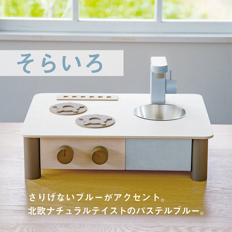 ■ インテリアになじむ日本製ままごとキッチン ■ 夕方になると台所からトントン、ザクザク、グツグツいいにおい。 水栓をきゅっとひねって、シンクで野菜を洗ったら、ピーラーでていねいに皮むき。 まな板でトントン切ったら、お鍋に入れて火にかけよう。 グツグツしたらつまみをひねって弱火で煮込んで。 グリルのお魚は焼けたかな?ちょっとだけ引き出して中を確認… そんなストーリーが思い浮かぶ台所。誰かのためを思ってつくる、おいしいごはん。 ままごとあそびはそんな思いやりのこころを育みます。 日常のくらしの1コマが再現できるような機能を、コンパクトなサイズにすべて収めました。 日本の職人が手作りした、どんなおうちにもすっと馴染む自然でおしゃれな色合いで、 くらしに寄り添う木のままごとキッチンです。 リビングやダイニングなど、子どもが遊ぶ場所は家族みんなが集まる場所。 自然の温もりを感じさせる優しい色あいとシンプルなデザインで、どんなおうちにもすんなりと溶け込みます。 3つのカラーバリエーションをご用意! お部屋の雰囲気に合わせてお好きな色をお選びいただけます。 ・北欧の風を感じる、心も落ち着くような優しいブルーがアクセントの「そらいろ」 ・どんなお部屋にも合わせやすく飽きのこない、穏やかで温かみのある「くるみいろ」 ・和室やモダンな空間にも合わせやすく、洗練されたシックな雰囲気を演出する「すみいろ」 |