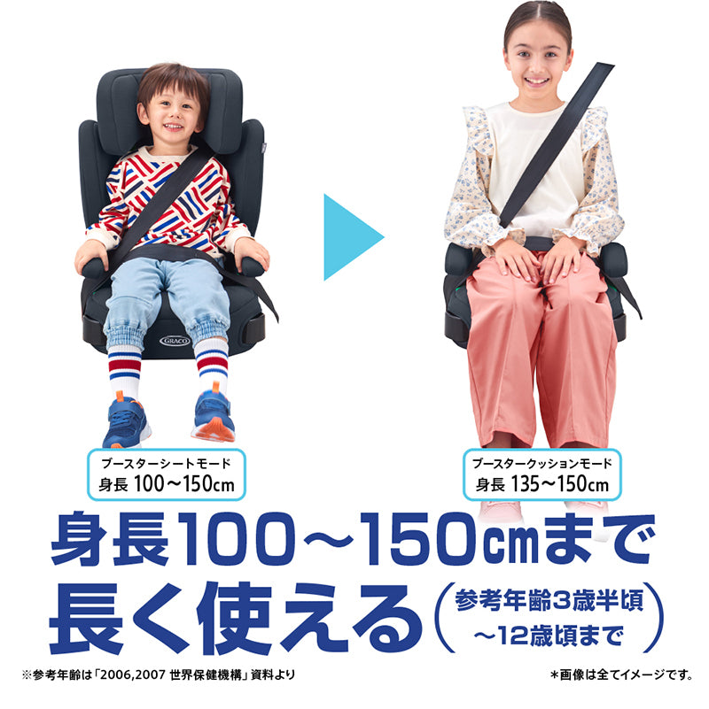 ブースターシートモード :身長 100~150 cm まで(参考年齢:3歳半頃 ~12 歳頃まで) ブースタークッションモード :身長 135~150 cm まで(参考年齢:10歳頃 ~12 歳頃まで) ※参考年齢は「 2006, 2007 世界保健機構」 資料 より |