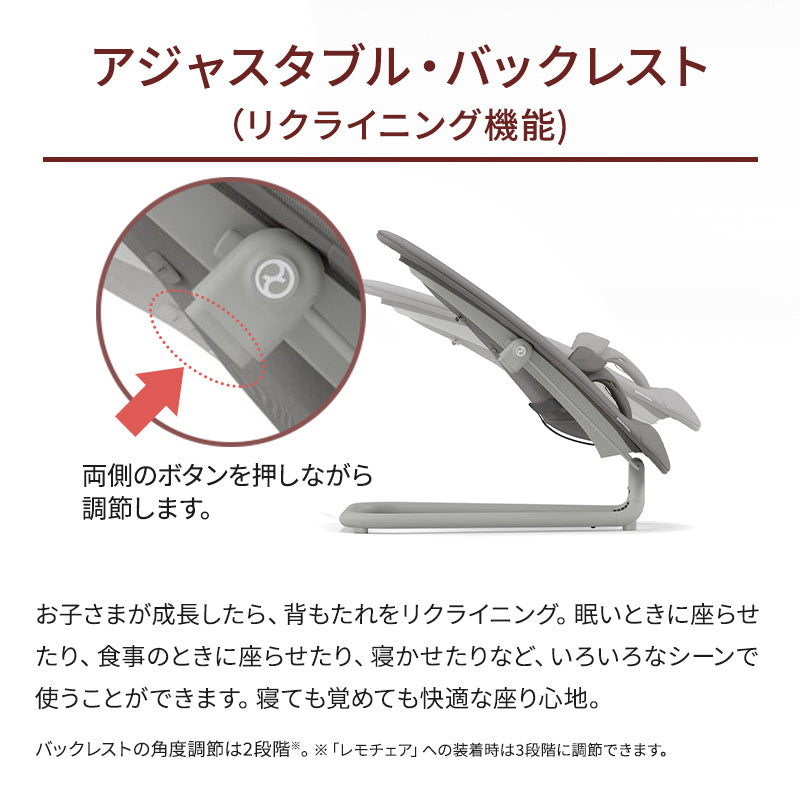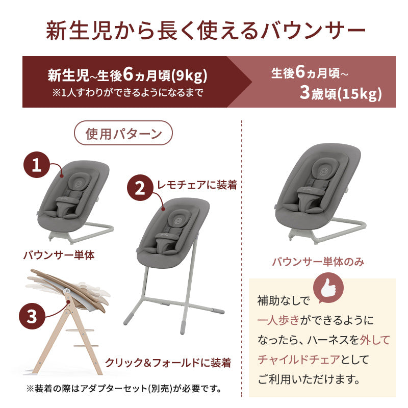 バウンサーとして使用する場合:新生児~3歳ごろ(15kg)まで ※補助なしでひとり歩きができるようになったら、ハーネスを外してチャイルドチェアとしてご利用いただけます。 レモチェア(別売り)に取り付けて使用する場合:新生児~生後6ヶ月ごろ(9kg)まで ※一人すわりができるようになるまで |