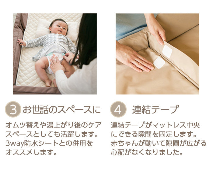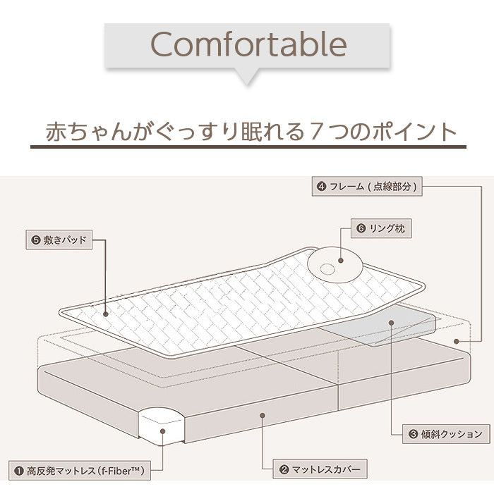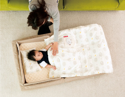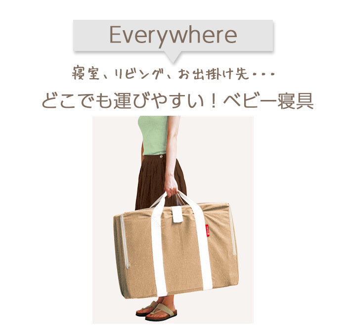 素材(全て共通) | (表地)ポリエステル100% 固綿:ポリエステル100% 2way布団カバー:(表生地)綿100% (裏生地)綿80%、ポリエステル20% ヌード布団:(生地)綿30%、ポリエステル70% (詰物)ポリエステル100% 敷きパッド:(生地)綿80%、ポリエステル20% (詰物)ポリエステル100% サイドパッド:(生地)ポリエステル100% (詰物)ウレタンフォーム リングまくら:(生地)綿80%、ポリエステル20% (詰物)ポリエステル100% 傾斜クッション:(生地)綿30%、ポリエステル70% (詰物)ウレタンフォーム |