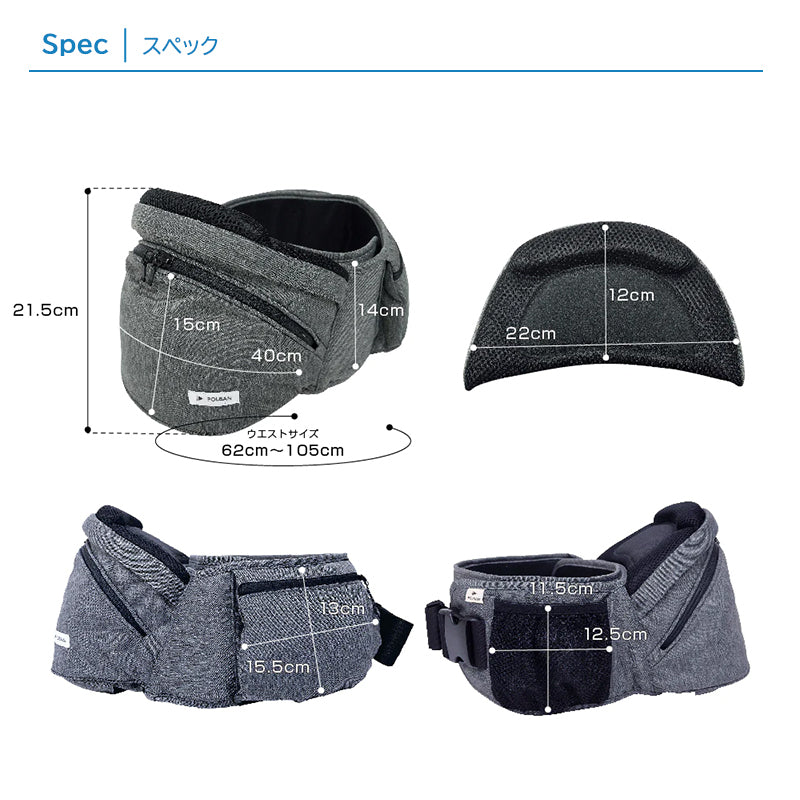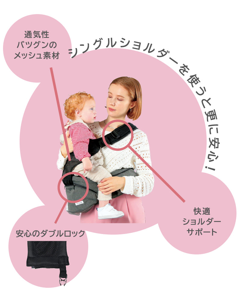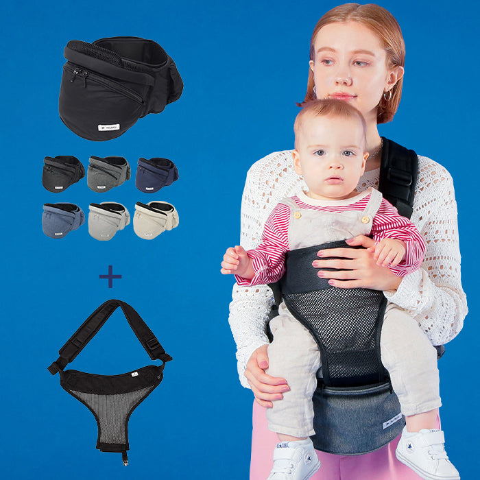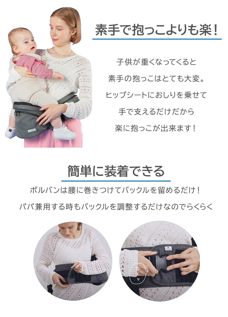 大人気のヒップシート「 ポルバン アドバンス 」(2023年モデル)とシングルショルダー(2023年モデル)の便利な2点セットです。 1.ポルバン アドバンス ポルバンは、抱っこしたり歩いたりが頻繁な1歳~3歳頃に活躍するヒップシート。赤ちゃんを乗せるだけで、対面抱っこ・前向き抱っこ・腰抱っこの3WAYに! 【使用月齢】 腰がすわった乳児期(7ヵ月頃)~36ヵ月(体重15Kg) ※ウエスト62cm~105cmくらいまで装着可能 【素材】 リップストップ : ナイロンリップ100% メランジグレー : ポリエステルメランジ100% デニムブラック : ポリエステル65% 綿35% 【重量(約)】 リップストップ:456g デニムブラック:527g メランジグレー:527g 2.シングルショルダーベルト オールメッシュ ヒップシート本体に取り付けて抱っこひもにできるショルダーパーツ。 全面メッシュ仕様で汗をかきやすい赤ちゃんも快適。使用しないときはコンパクトにたたんで本体ポーチに収納できます。 |