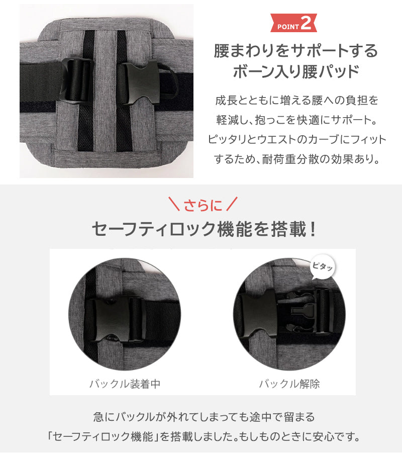 使用月齢 | 生後14日(体重3.2kg/身長51cm以上)~48ヵ月(体重約20kg)まで 別売りのシングルショルダーもご使用いただけます。 |