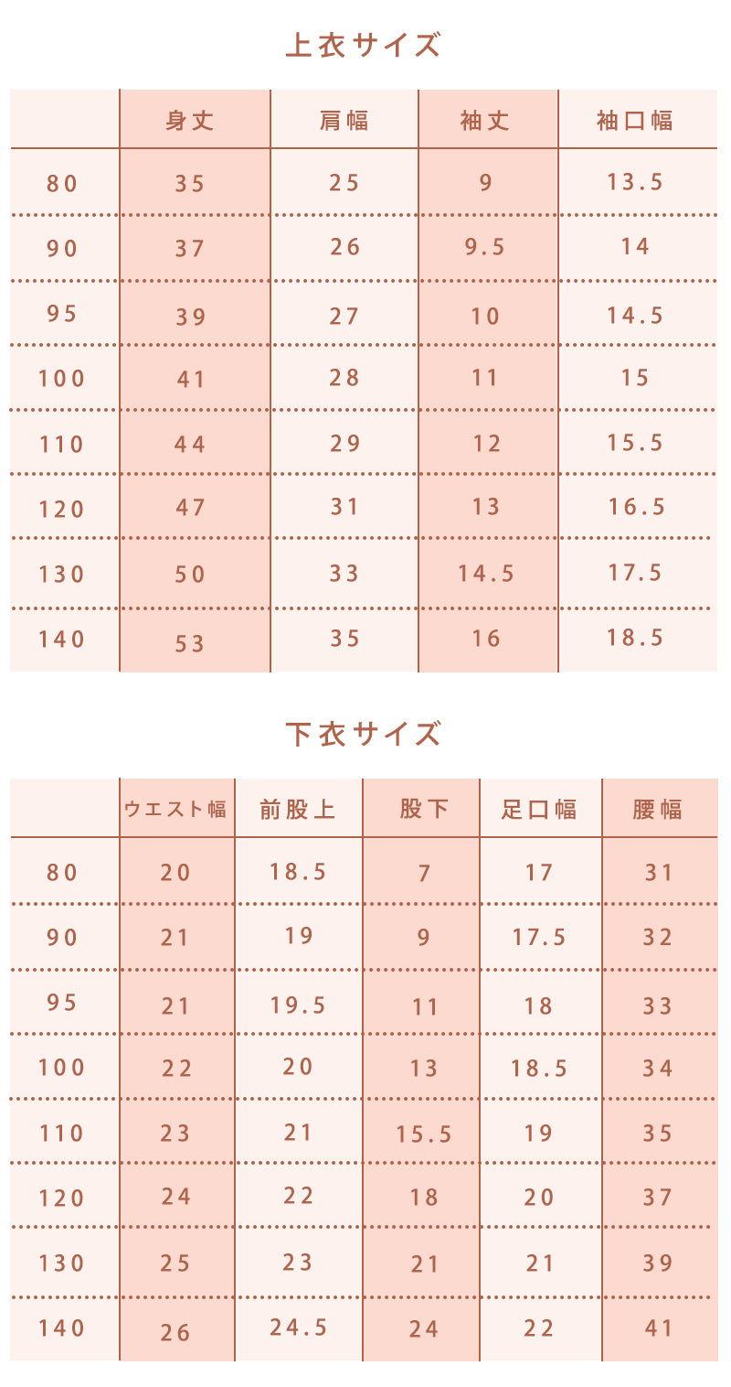 | サイズ (【上衣】身丈/肩幅/袖丈/袖口幅/【下衣】ウエスト幅/前股上/股下/足口幅/腰幅) |