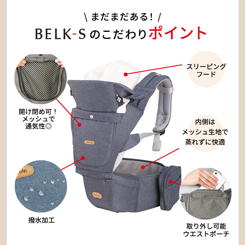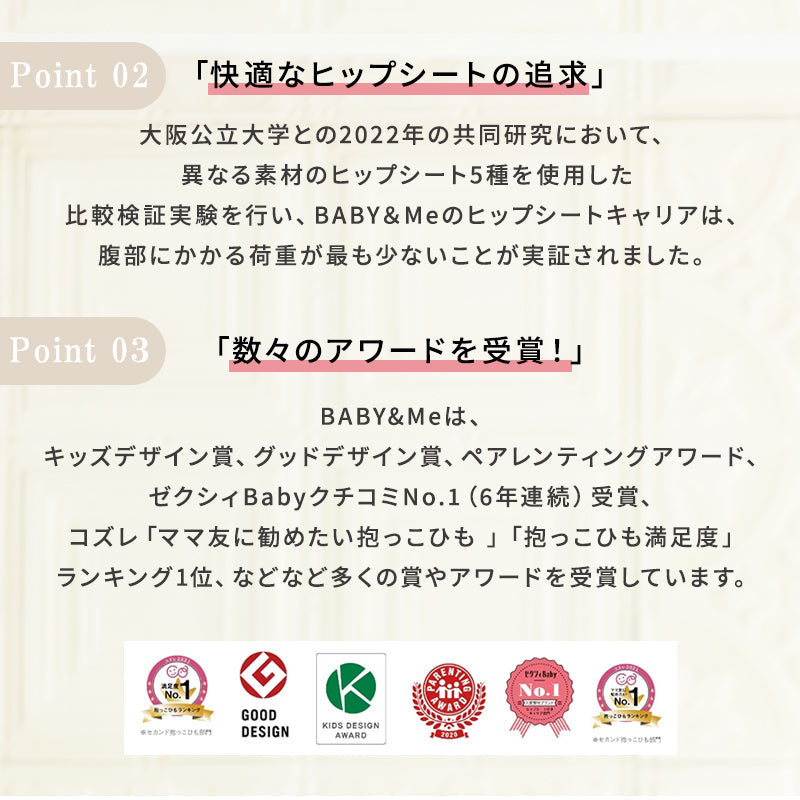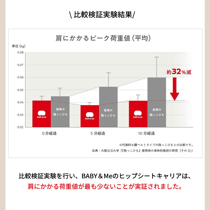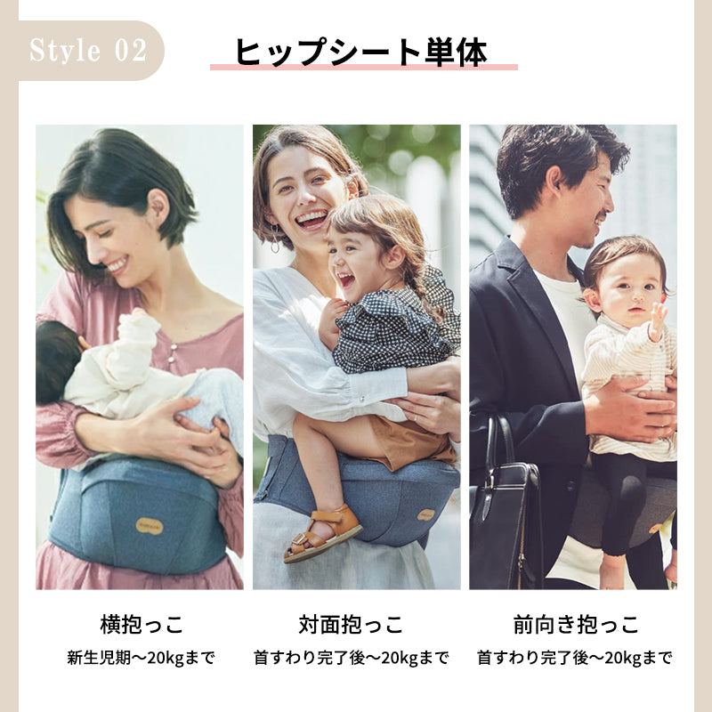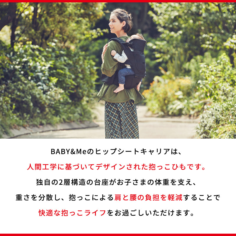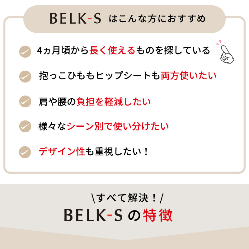 【BABY&Me ヒップシートキャリア】 BABY&Meのヒップシートキャリアは、人間工学に基づいてデザインされた抱っこひもです。 独自の2層構造の台座がお子さまの体重を支え、重さを分散し、抱っこによる肩と腰の負担を軽減することで快適な抱っこライフをお過ごしいただけます。 〇真似できない楽さの理由 ママパパと赤ちゃんのために独自の2層構造(デュアルフォーム)を採用しています。 重さを支え分散するEPPフォームと下腹部への負担を軽減するウレタンフォームの組み合わせにより快適な抱っこが可能です。 〇快適なヒップシートの追求 大阪公立大学との2022年の共同研究において、異なる素材のヒップシート5種を使用した「腹部にかかるピーク荷重値(平均)」の比較検証実験を行い、 BABY&Meのヒップシートキャリアは、腹部にかかる荷重が最も少ないことが実証されました。 〇大切なことは赤ちゃん、ママ、パパ、みんなが快適であること 私たちBABY&Meは、生命の誕生という一生に一度しかない瞬間からはじまるママやパパ、家族の新たなライフステージにおいて、 「抱っこ」という大切なコミュニケーションを通じて、たくさんの笑顔やたくさんの幸せが溢れる育児を応援しています。 【BELK-S】 首すわり完了後の4ヶ月頃からおすすめの「BELK-S」。 抱っこするママパパの肩・腰への負担を軽減してくれるヒップシートキャリアです。 〇使用方法 ・ヒップシート+キャリア (1)対面抱っこ 4ヶ月頃(首すわり完了後)〜48ヶ月頃(20kg)まで (2)前向き抱っこ 7ヶ月頃(腰すわり完了後)〜48ヶ月頃(20kg)まで (3)おんぶ 7ヶ月頃(腰すわり完了後)〜48ヶ月頃(20kg)まで ・ヒップシート (1)対面抱っこ 4ヶ月頃(首すわり完了後)〜48ヶ月頃(20kg)まで (2)前向き抱っこ 4ヶ月頃(首すわり完了後)〜48ヶ月頃(20kg)頃まで (3)横抱っこ 0ヶ月〜48ヶ月頃(20kg)まで ※ヒップシート単体の使用はSGマーク制度対象外 |