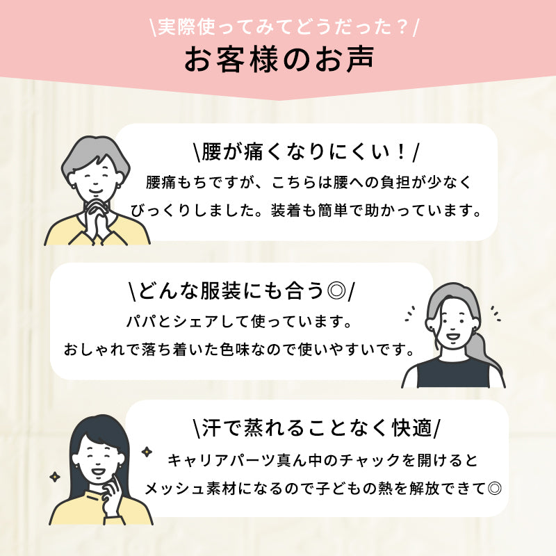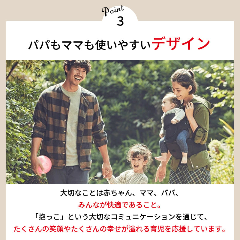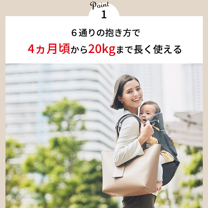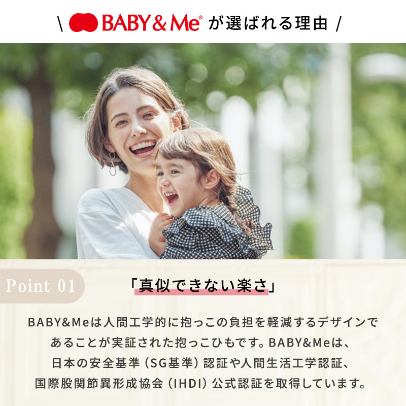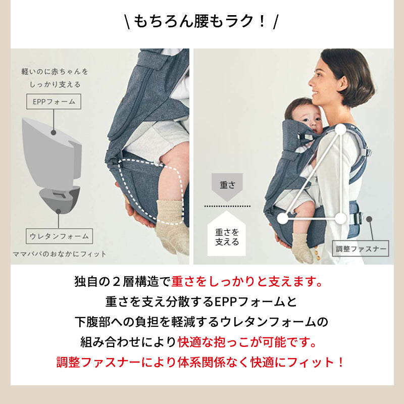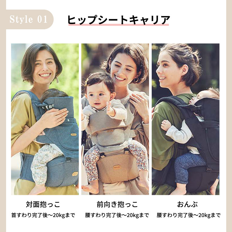 【BABY&Me ヒップシートキャリア】 BABY&Meのヒップシートキャリアは、人間工学に基づいてデザインされた抱っこひもです。 独自の2層構造の台座がお子さまの体重を支え、重さを分散し、抱っこによる肩と腰の負担を軽減することで快適な抱っこライフをお過ごしいただけます。 〇真似できない楽さの理由 ママパパと赤ちゃんのために独自の2層構造(デュアルフォーム)を採用しています。 重さを支え分散するEPPフォームと下腹部への負担を軽減するウレタンフォームの組み合わせにより快適な抱っこが可能です。 〇快適なヒップシートの追求 大阪公立大学との2022年の共同研究において、異なる素材のヒップシート5種を使用した「腹部にかかるピーク荷重値(平均)」の比較検証実験を行い、 BABY&Meのヒップシートキャリアは、腹部にかかる荷重が最も少ないことが実証されました。 〇大切なことは赤ちゃん、ママ、パパ、みんなが快適であること 私たちBABY&Meは、生命の誕生という一生に一度しかない瞬間からはじまるママやパパ、家族の新たなライフステージにおいて、 「抱っこ」という大切なコミュニケーションを通じて、たくさんの笑顔やたくさんの幸せが溢れる育児を応援しています。 【BELK-S】 首すわり完了後の4ヶ月頃からおすすめの「BELK-S」。 抱っこするママパパの肩・腰への負担を軽減してくれるヒップシートキャリアです。 〇使用方法 ・ヒップシート+キャリア (1)対面抱っこ 4ヶ月頃(首すわり完了後)〜48ヶ月頃(20kg)まで (2)前向き抱っこ 7ヶ月頃(腰すわり完了後)〜48ヶ月頃(20kg)まで (3)おんぶ 7ヶ月頃(腰すわり完了後)〜48ヶ月頃(20kg)まで ・ヒップシート (1)対面抱っこ 4ヶ月頃(首すわり完了後)〜48ヶ月頃(20kg)まで (2)前向き抱っこ 4ヶ月頃(首すわり完了後)〜48ヶ月頃(20kg)頃まで (3)横抱っこ 0ヶ月〜48ヶ月頃(20kg)まで ※ヒップシート単体の使用はSGマーク制度対象外 |