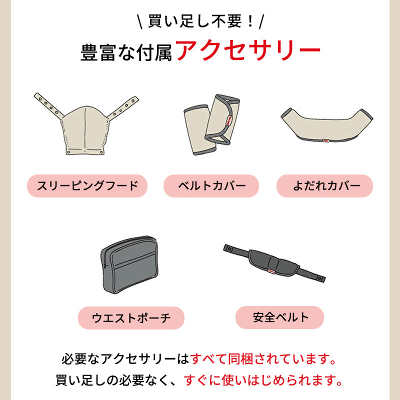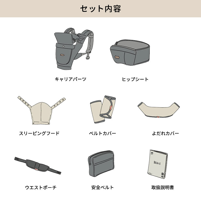 ヒップシート、キャリアパーツ、ベルトカバー(左右セット)、前向きよだれカバー、スリーピングフード、安全ベルト、ウエストポーチ、取扱説明書(保証書付き) |