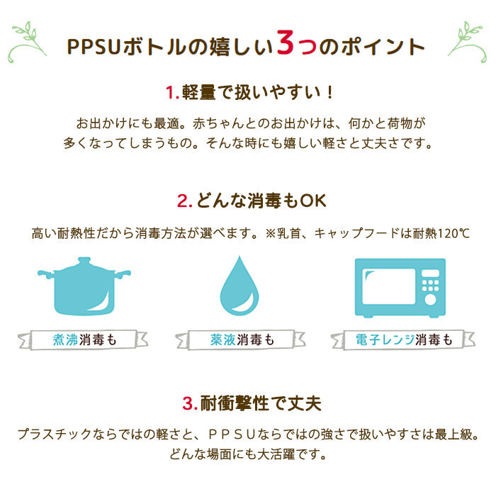 材質 | ボトル:PPSU キャップフード:ポリプロピレン 乳首:シリコーン |