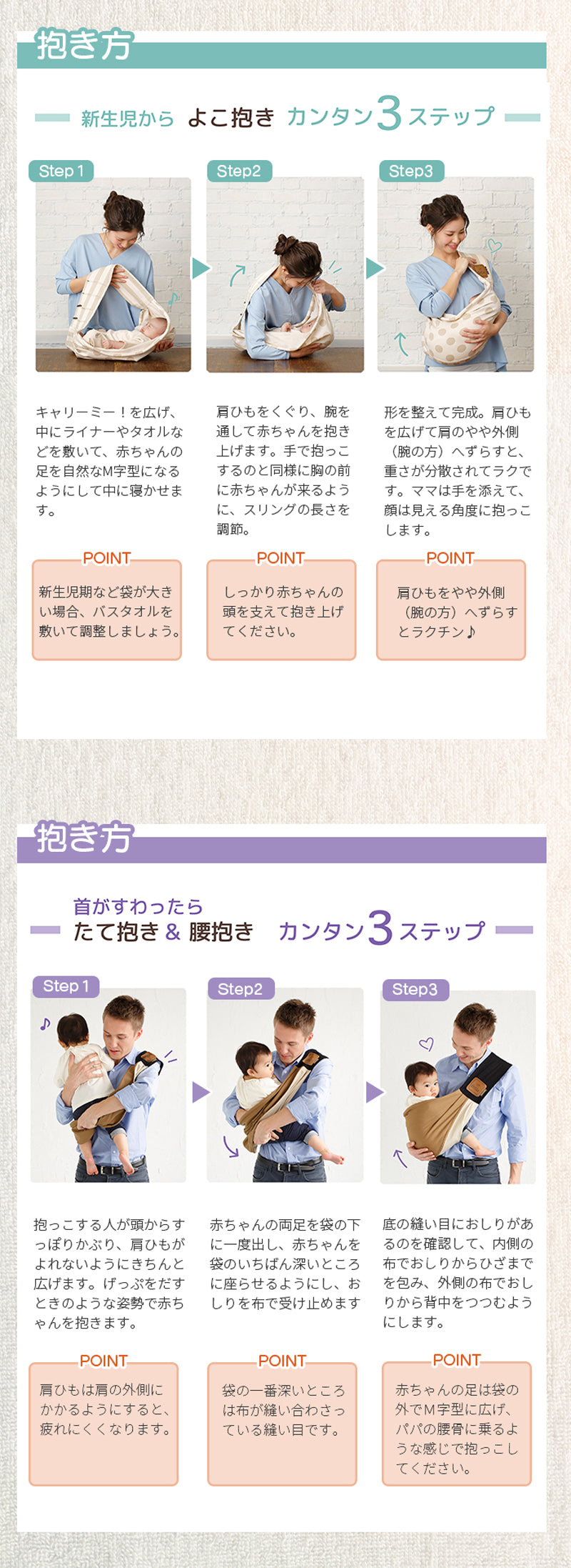 多くのお客様に愛されるベッタのスリング。 「 ベッタ キャリーミー ! 」 として商品ブランドがリニューアルしました。 赤ちゃんとママパパを考えたより安心でやさしい、世界中で愛される抱っこ紐へ。 匠が丁寧に作り上げた日本製のベッタスリングはキッズデザイン賞を受賞しています。 ベビーに安心の商品だから、ギフトにも最適です。 新生児の赤ちゃんは横抱きや、さかさ抱きで。 首がすわって赤ちゃんの腰がしっかりしたら、たて抱きや腰抱きも可能。 いろいろな抱き方ができ、長さの調整もできるので、とても便利にお使い頂けます。 簡単装着で、軽くてコンパクトなので、お出かけのお供にも最適です。 [ポイント] ○新生児から11.3キロまで使える!簡単抱っこ 新生児から11.3kgまで使えて、簡単に装着可能。 新生児は「よこ抱き」首腰がすわってきたら「たて抱き」or「腰抱き」。 ○パパママ兼用 ロック付きファスナーで長さ調節 肩ひもの長さを変えられるからパパとの共用もしやすい! 調整後は、ファスナーの引き手を倒してロックを忘れずに。 ○軽量&コンパクト わずか約250g!畳むと、なんと手帳サイズに! かさばらないから、ベビーカーや車でのお出かけにも便利♪ 抱っこ紐特有の着脱の手間や、かさばって困る...などの悩みも解決です。 毎日の子育てを考えた、軽くて収納が便利なベッタキャリーミー ! がおすすめ。 ○安心の立体裁断& made in Japan 職人による縫製 ベッタ独自の立体裁断は、赤ちゃんがすっぽり包める大きめサイズ。 底がまあるくなっているので、赤ちゃんが動いても安定感のある抱っこができます。 日本の職人が1枚1枚丁寧に作った安心安全のスリングです。 [たて抱きの装着方法] 1.輪になっているところをかぶり肩ひもを広げ、げっぷ出しのような姿勢で赤ちゃんを抱きます。 (※肩ひもは肩の外側にかかるようにすると疲れにくくなります。) 2.赤ちゃんを袋の一番深いところに座らせるようにして、おしりを布で受け止めます。 3.袋の底の縫い目におしりがあるのを確認。手前の布でおしりから足までを包み、赤ちゃんの背中側の布でおしりから背中を包むようにします。 (赤ちゃんの足は袋の外でM字型にひろげ、ママのおなかをまたぐようにしましょう。) 商品説明内で一部終売商品を掲載しております。ご了承ください。 ベッタ キャリーミー!プラスはベッタ キャリーミー !へ2019年5月にリニューアルされました。 ※後続品となりますので、引き続きキャリーミー!プラスの商品ページを使用しています。 |