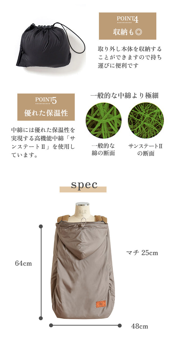 ・フード部分のゴムを出し入する際に穴から中綿が出てくる場合がございますのでご注意ください。