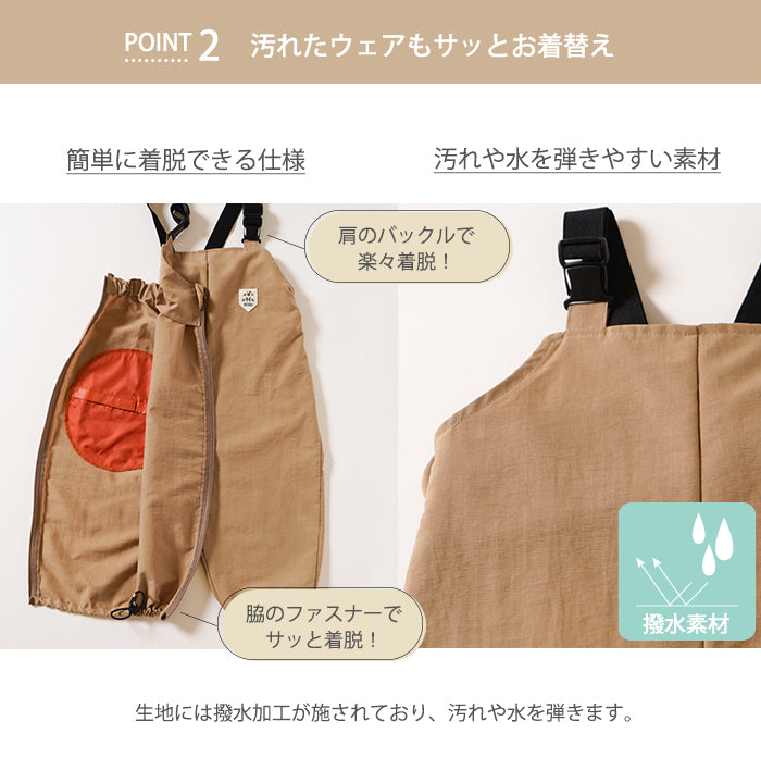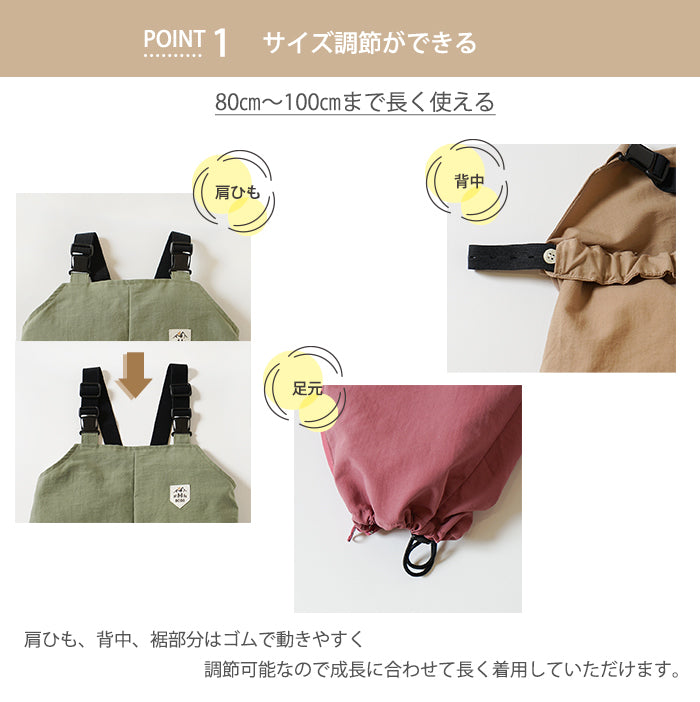 ご使用上の注意 | ・ファスナー開閉やアジャスターの調整、バックルの開閉は必ず保護者が行ってください。 ・ファスナー開部横方向に大きな負荷をかけたり、ひねりの力が加わりますと破損の原因となりますのでご注意ください。 ・ファスナーに砂、埃、泥など異物が付着した状態で使用されますと損傷、機能障害などの原因につながる恐れがあります。異物を取り除いてからご使用ください。 ・撥水素材を使用しておりますが、ファスナーや縫い目から水がしみ出る恐れがありますのでご注意ください。 ・足元のゴムは調整次第で長くなりますので、着用の際はゴムが裾から出ないようにしてください。また、遊ぶ時や、着脱の際にはゴムによる引っかかりにご注意ください。 ・火気や暖房器具などには近づけないでください。 |
