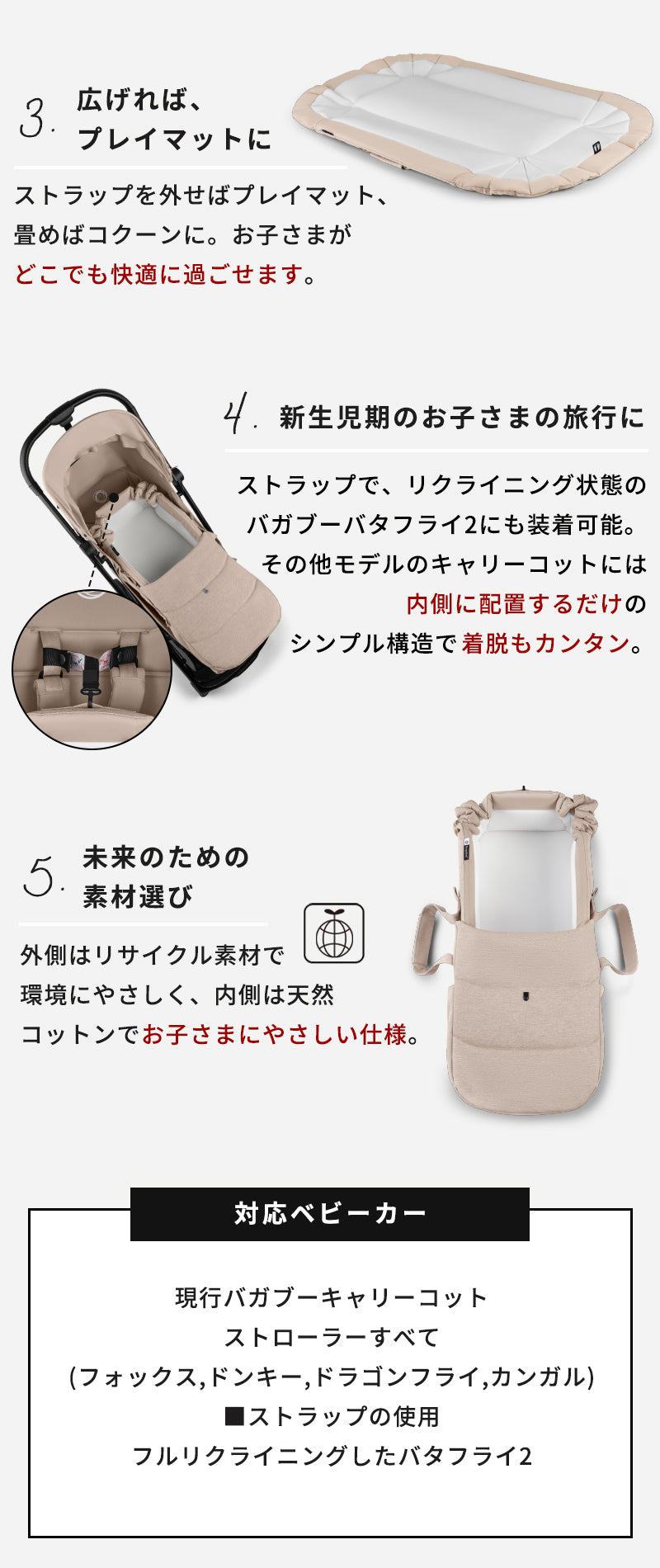 1.お子さまの睡眠を妨げずに移動 バガブーストローラーのほぼ全てのモデルで使用できるバガブーベビーネストは、新生児に快適な空間を提供します。 便利なキャリーストラップにより、赤ちゃんの睡眠を妨げることなく持ち上げることができ、日常の外出や旅行に最適です。 2.天然の柔らかな手触り 人間工学に基づいた、柔軟性に優れた設計。温度調節機能も備えています。 直接肌に触れる裏地と堅牢なマットレスには、通気性があり、吸収性が高く、赤ちゃんに優しい天然コットンを使用。 リサイクル素材を使用した外側生地と取り外し可能なエプロンで、お子さまをしっかりと保護します。 3.広げれば、プレイマットに バガブー ベビーネストは、2つの機能を備えた2-in-1設計。 ストラップのストッパー部分を外して広げれば、プレイマットに早変わり。 新生児期のお子さまを自宅はもちろん外出先でも遊ばせることができます。 クッション素材が入っているので、赤ちゃんがマットの上を快適に動き回れます。 外出する際は、側面を折りたたんでストラップを引けば、快適なコクーンに戻ります。 4.新生児期のお子さまの旅行に 新生児と一緒の移動をスムーズに。 バガブー ベビーネストは、完全にリクライニングした状態のバガブーバタフライ2にも取り付けることができます。 取り付け方法はシンプルなので、ストローラーを折りたたむ際にすぐに取り外すことも可能です。 5.未来のための素材選び リサイクルファブリック バガブー ベビーネストの外側のファブリックは100%リサイクルペットボトルからできています。 この素材は、CO2排出量を削減するだけでなく、手触りがよく、洗練された質感です。 天然の生分解性コットン 内側のライニングは天然の、生分解性素材であるコットンを使用しています。 |