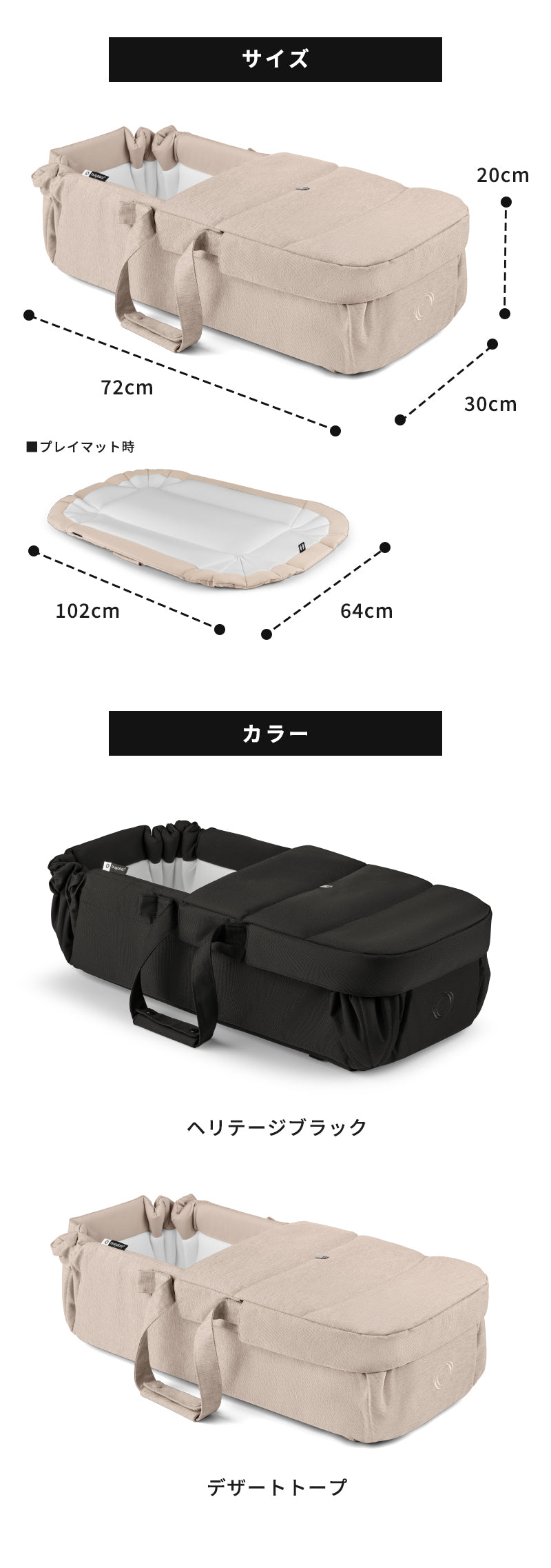ベビーネスト:縦30×横72×高さ20(cm) 展開時(プレイマット):縦64×横102×高さ3(cm) |