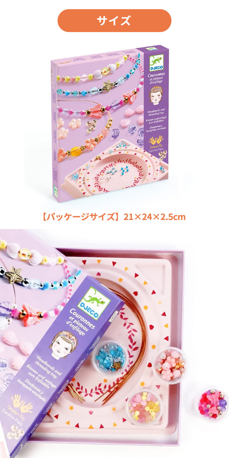 DJECO(ジェコ)という名前は、Gecko(ゲッコ)というトカゲからつけられています。 トカゲ(Gecko)は、その姿を見たり、家に住み着いたりすると幸福になるという言い伝えがあります。 みんなが幸福になれるようにと「DJECO」という社名がつけられ、ロゴマークにトカゲが使われています。 DJECO(ジェコ)のコンセプト/「遊びは子供の成長にとって大変重要なもの」 情熱的で独創的なDJECOのコレクションは、楽しく、知育的で、デザインと色遣いに特徴があります。 子供達の感性と想像力を育み、世界中で愛用されています。 かわいいカチューシャが作れるキットです。 作業代の中央のくぼみに、1セット分のビーズを入れます。 枠にビーズを並べて、ビーズの配置を決めます。 配置が確認できたら、バンドにビーズを通して完成です。 |