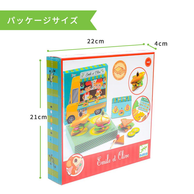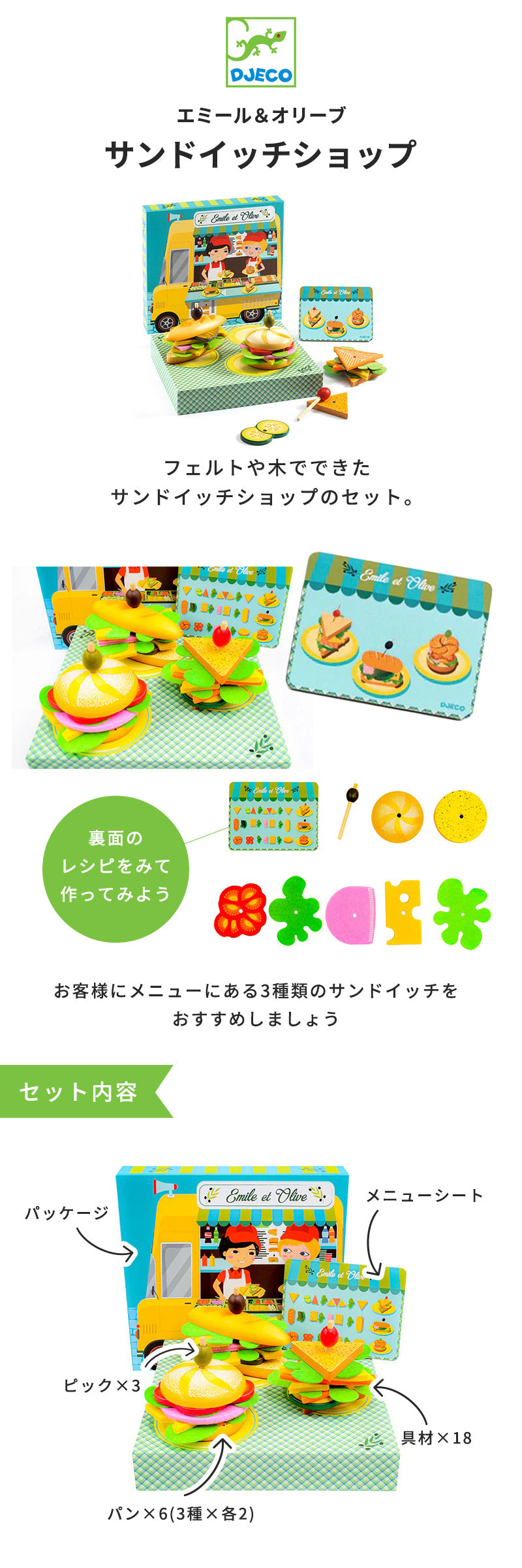 | DJECO(ジェコ)という名前は、Gecko(ゲッコ)というトカゲからつけられています。 トカゲ(Gecko)は、その姿を見たり、家に住み着いたりすると幸福になるという言い伝えがあります。 みんなが幸福になれるようにと「DJECO」という社名がつけられ、ロゴマークにトカゲが使われています。 DJECO(ジェコ)のコンセプト/「遊びは子供の成長にとって大変重要なもの」 情熱的で独創的なDJECOのコレクションは、楽しく、知育的で、デザインと色遣いに特徴があります。 子供達の感性と想像力を育み、世界中で愛用されています。 【エミール&オリーブ サンドイッチショップ】 お店屋さんごっこが楽しめるサンドイッチショップのセットです。 お客様にメニューにある3種類のサンドイッチをおすすめしましょう。 サンドイッチを美味しそうに上手く重ねましょうね♪ 気分はまるで本物のサンドイッチ屋さん♪ |