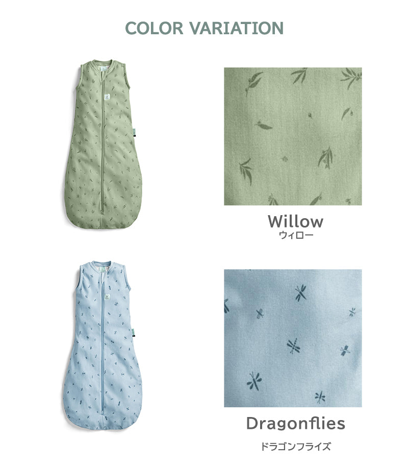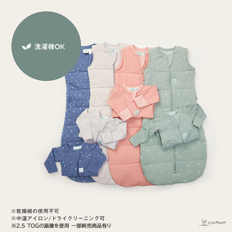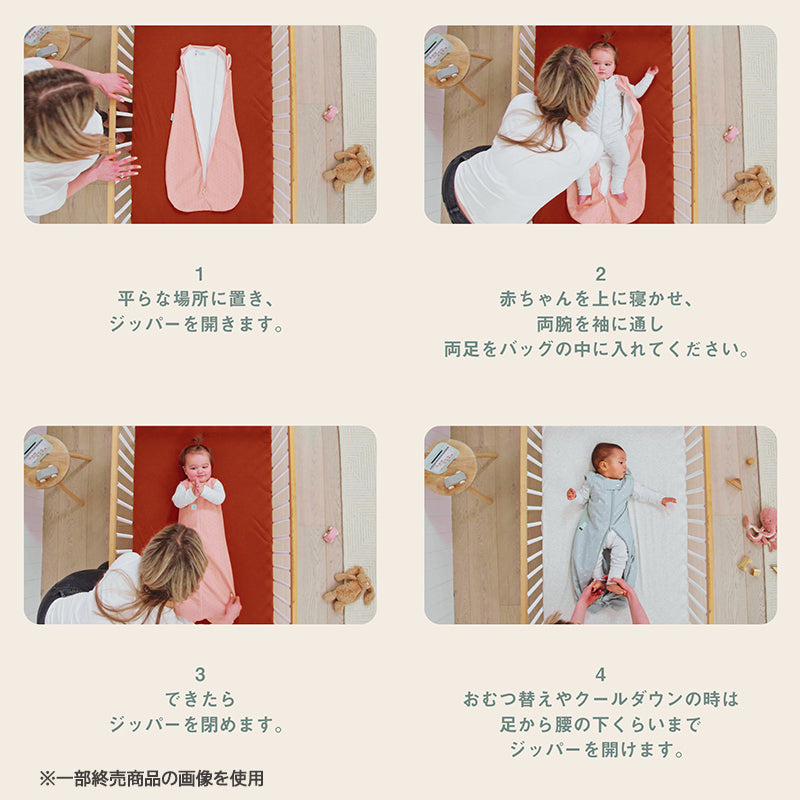 【ジャージースリーピングバッグ 1.0TOG】 寝返りやおすわりをするようになり、足の動きがより活発的になってきたら、ジャージースリーピングバッグにステップアップしましょう。 "スワドルが卒業できない"とお悩みの方にも試してほしい、寝袋タイプのスリーパーです。 ※着用したまま、お子様が歩き回らないよう注意してください。 ※1.0TOG:室温21~24℃の使用がおすすめです。 室温に合わせて、中に肌着やロンパース・パジャマなどのレイヤーを着せてあげましょう。 【TOGとは】 TOGとはThermal Overall Gradeの略で、寝具や寝装品の断熱性・保温性を表す単位です。簡単に言うと、TOGの数値が低いほど生地が軽く、高いほど中綿や保温性が高いということです。 TOGが高いほど、中綿が多く、保温性が高いということになります。赤ちゃんは大人のように体温調節ができないので、TOGランクの生地は重要です。 |