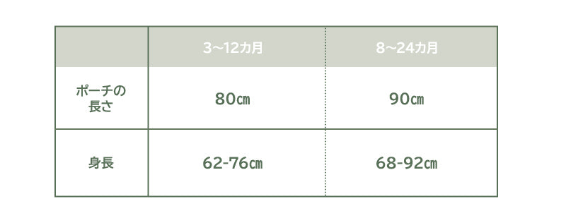 3~12ヶ月(80cm)、8~24ヶ月(90cm) |