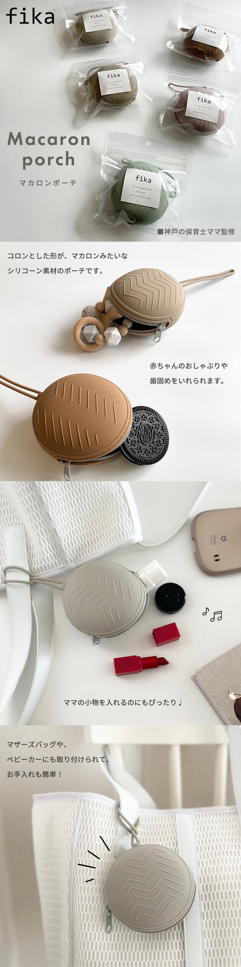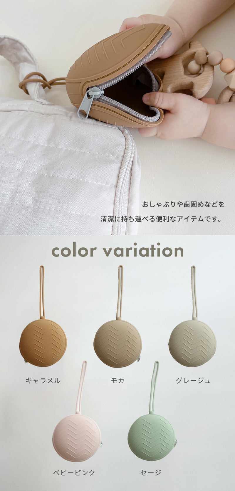 | コロンとした形が、マカロンみたいなシリコーン素材のポーチです。 赤ちゃんのおしゃぶりや歯固めをいれたり、ママの小物を入れるのにもぴったり! マザーズバッグや、ベビーカーにも取り付けられて、お手入れも簡単! おしゃぶりや歯固めなどを清潔に持ち運べる便利なアイテムです。 fikaのteether ringがすっぽり入るのでセットでプレゼントにもおすすめです♪ |