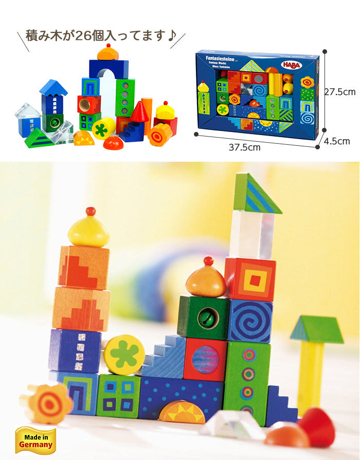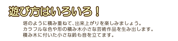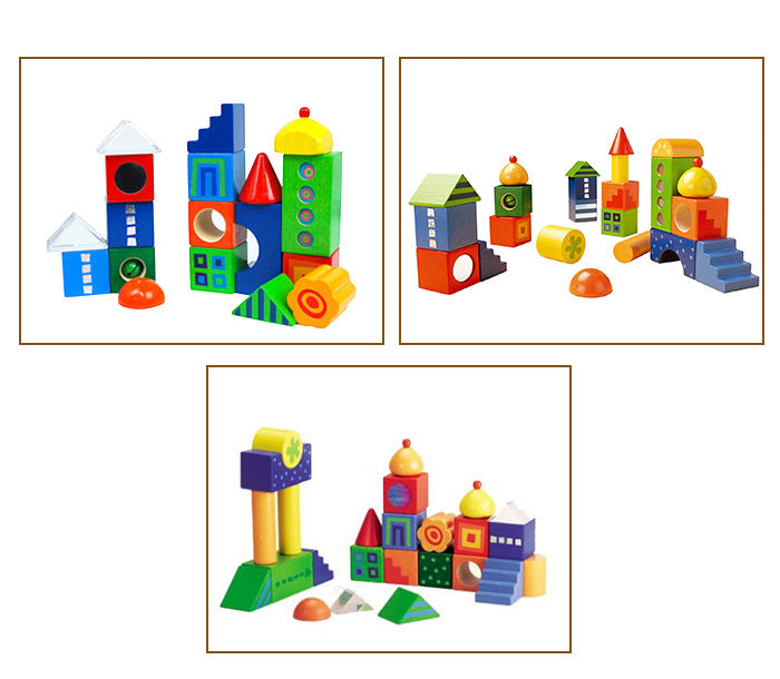 楽しい色、柄、形が溢れ、子どもたちを夢中にさせる積み木です。ひとつひとつのブロックはそれぞれ個性的なデザイン。五感をフルに使って遊べます。