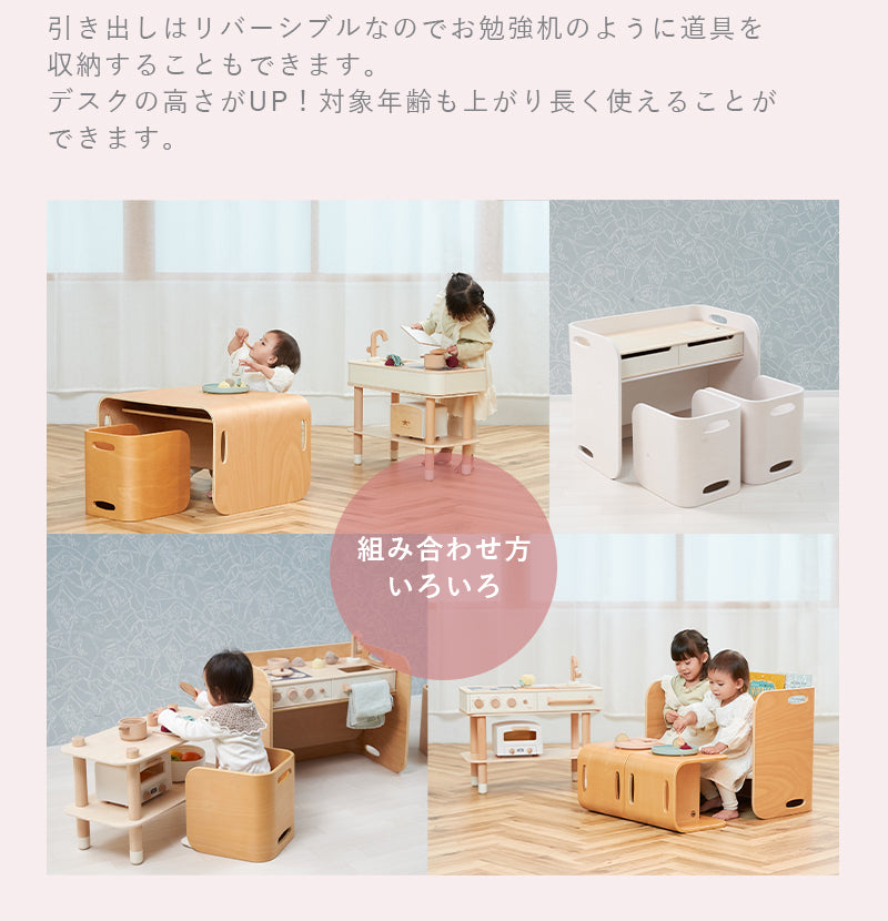 コンパクトなチェストタイプのままごとキッチンは、ひっくり返すだけでコロコロと使い方が 変化するリバーシブルの引き出し&天板のしかけで、