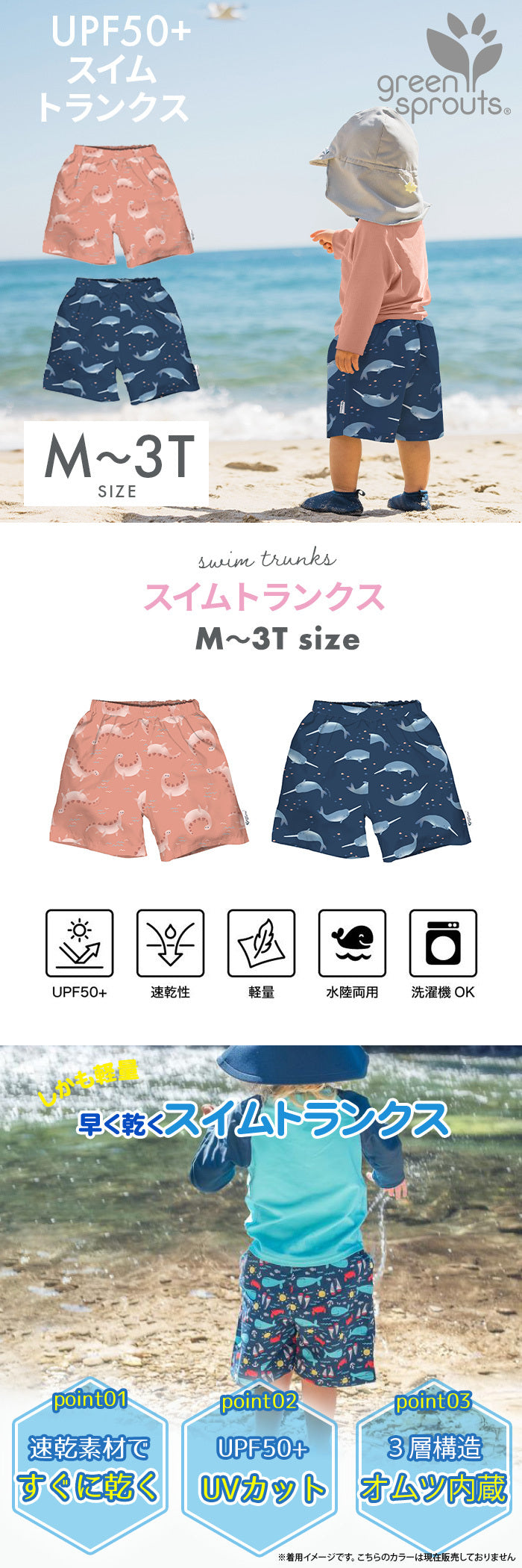 i play スイムパンツ内蔵 スイムトランクス M-3T コーラルディノ/ネイビーナルホエール