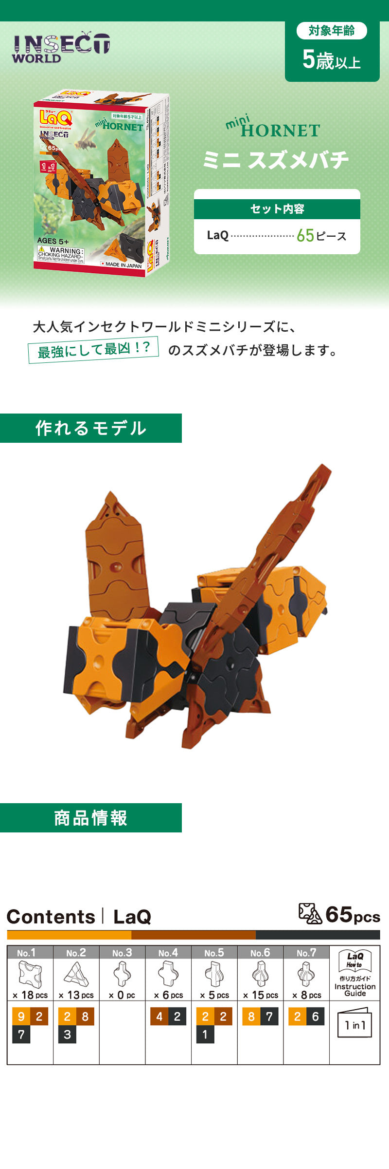 LaQ(ラキュー)は、たった7種類の小さな平面・立体・球体とあらゆる形に変化する、まったく新しい発想から生まれたパズルブロックです。 LaQは日本人の文化と価値観から生まれた知育ブロックとして海外で評価されています。 [知育ブロックとしてのLaQ] ●色彩感覚 赤、青、黄の三原色と森の色である緑、そして黒、白、パステルカラーの7色。 これらの色を組み合わせることにより、色彩感覚を身につけます。 ●想像力・表現力 ブロックで作ったものを何かにたとえたり、動物や乗り物をブロックで表現したりすることで想像力や表現力を身につけます。 ●集中力 ブロックをつないだときの感触は、お子様の総意欲に対する心地よい刺激となり、ブロック遊びに夢中になります。 遊びながら知らず知らずのうちに集中力を身につけます。 ●論理的・数学的思考 立体や多面体などの幾何学図形を作ることは、数学的思考や論理的思考の発達の大きな助けとなります。 ※転売目的でのご購入をご遠慮ください。幼稚園など団体様以外への大量注文はお断りする場合があります。 【ミニスズメバチ】 大人気インセクトワールドミニシリーズに、最強にして最凶!?のスズメバチが登場します。 ※商品の写真、イラストは実際の商品と異なる場合がございますのでご了承下さいませ。 |