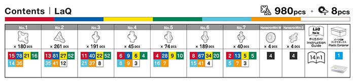 | セット内容 | LaQ 980ピース+ハマクロンミニホイール4ピース+ハマクロンミニシャフト4ピース |