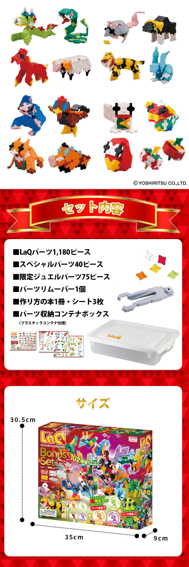 LaQ(ラキュー)は、たった7種類の小さな平面・立体・球体とあらゆる形に変化する、まったく新しい発想から生まれたパズルブロックです。 LaQは日本人の文化と価値観から生まれた知育ブロックとして海外で評価されています。 [知育ブロックとしてのLaQ] ●色彩感覚 赤、青、黄の三原色と森の色である緑、そして黒、白、パステルカラーの7色。 これらの色を組み合わせることにより、色彩感覚を身につけます。 ●想像力・表現力 ブロックで作ったものを何かにたとえたり、動物や乗り物をブロックで表現したりすることで想像力や表現力を身につけます。 ●集中力 ブロックをつないだときの感触は、お子様の総意欲に対する心地よい刺激となり、ブロック遊びに夢中になります。 遊びながら知らず知らずのうちに集中力を身につけます。 ●論理的・数学的思考 立体や多面体などの幾何学図形を作ることは、数学的思考や論理的思考の発達の大きな助けとなります。 ※転売目的でのご購入をご遠慮ください。幼稚園など団体様以外への大量注文はお断りする場合があります。 [LaQ ボーナスセット2025 9000] 【数量限定!】 毎年完売必須、LaQ ボーナスセットの最新作!! 2025年はなんと大人気のジュエルパーツが限定カラーで登場します! 作例の102種類! パーツがバランスよく入っているのでLaQ入門者さんにも上級者さんにもオススメです! 定番のパーツリムーバー、蓄光パーツも入っています! 【パーツリムーバーって?】 パーツをはずしやすくするための道具。 固くて取りにくいジョイントもこれさえあれば簡単に外せます! |