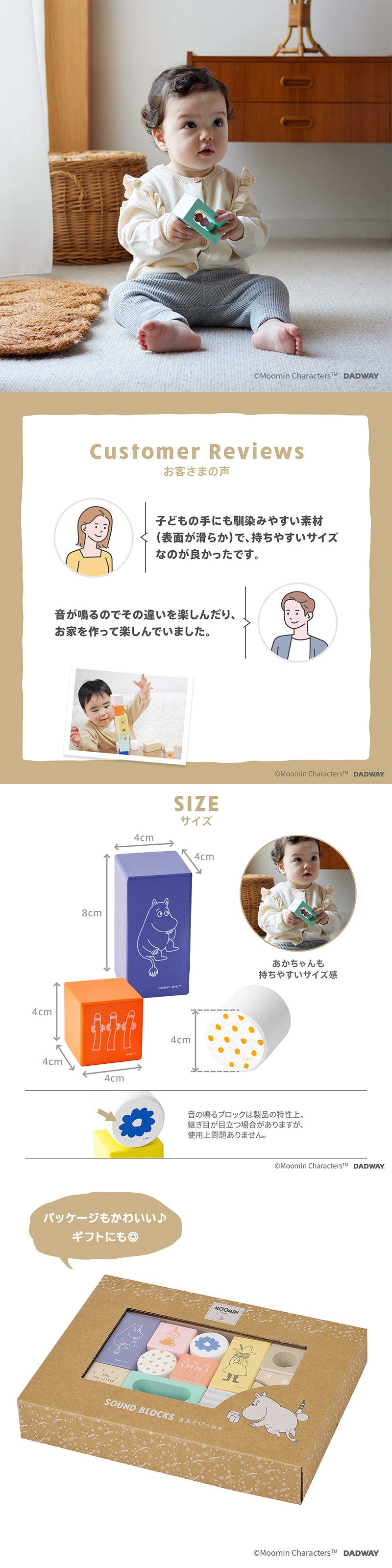 【音あそびつみ木 ムーミン】 ムーミンのなかまたちと重ねて並べてつみ木遊び。 コロコロ、カラカラ、いろいろな音が楽しめるつみ木。 ミラーや、動くパーツで見た目も楽しい! インテリアを邪魔しない色合い。 月齢が低いうちはラトルとしても楽しめます。 ※音の鳴るブロックは製品の特性上、継ぎ目が目立つ場合がありますが、使用上問題ありません。 |