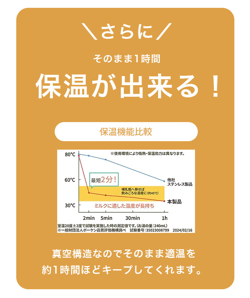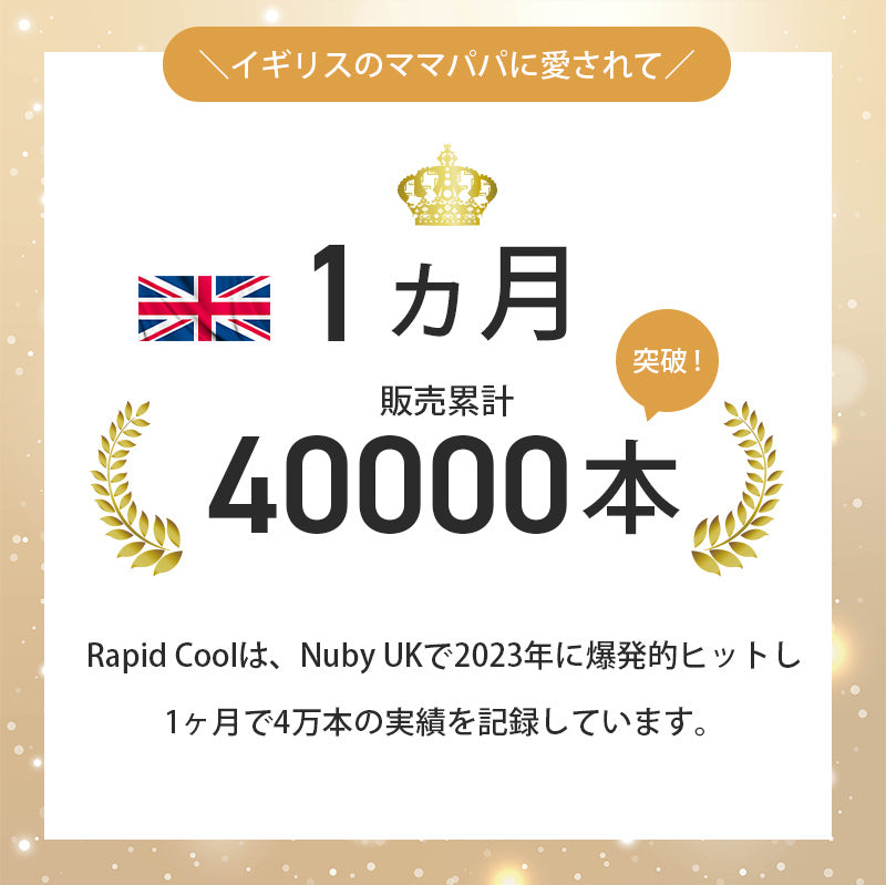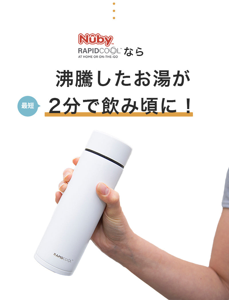 Nuby UKで爆発的ヒット!1ヶ月で4万本の実績を記録した調乳用ステンレスボトル! 使い方は簡単!RapidCool に沸騰したお湯と粉ミルクを入れてシェイクするだけ。 約2〜5分でミルクが授乳に適した温度に冷めます。 (※お湯の量によります。) そのまま1時間ほど温度をキープするので、時間を置いて授乳することも可能、夜間調乳にも最適。 流行に左右されることのない、シンプルで使いやすいデザイン。 カラーはホワイトとグレーの2色展開になっています。 本体直径は65mmと、バッグなどのちょっとした隙間にすっぽり入るスリムな形状で、 持ち運びにも便利。フィルターレスなのでお手入れも簡単です。 電力を使わずボトルの構造のみで冷却・保温するので、おうちでもお外でも使えます。 吸熱素材を用いた特殊設計により、最短2分でお湯を授乳に最適な約40℃程度まで冷まします(※)。 また、ボトルは真空構造になっているので、そのまま適温を約1時間ほどキープしてくれます。 本体はステンレススチール製で、マイクロプラスチック・BPAフリーなので安心です。 ※ミルク量90mlで約2分、240mlで約5分ほどで冷めます。 ミルクを卒業しても、お子様の飲料、猫舌ママの飲み物も数分で飲み頃にでき、 長くご利用いただけます♪ |