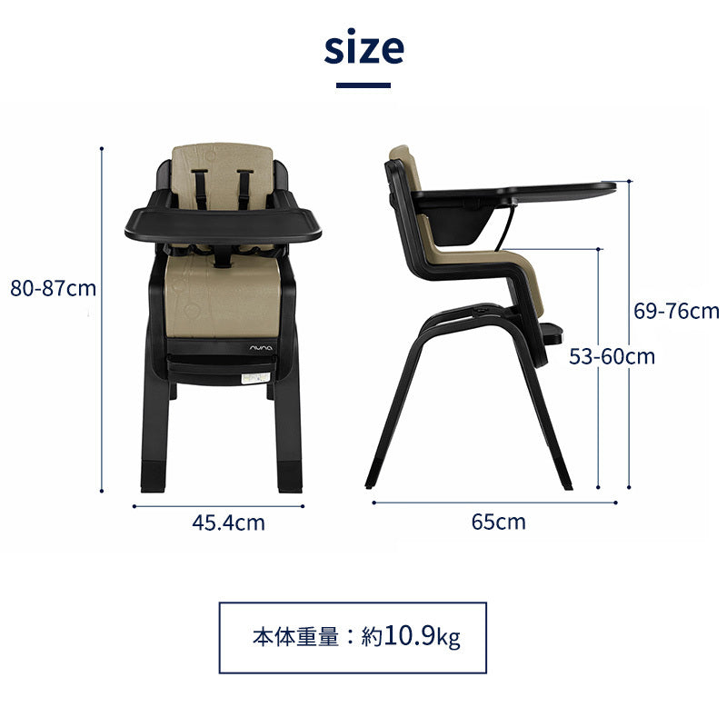 テーブルトレー無し:L 53 × W 45.4 × H 80-87 テーブルトレー付き:L 65 × W 45.4× H 80-87 ・座高:最上60cm、最下53cm ・テーブル上部:最上76cm、最下69cm ・テーブルサイズ:W45.4×D27.3cm(中央部) ※奥行き(L) × 幅(W) × 高さ(H) |