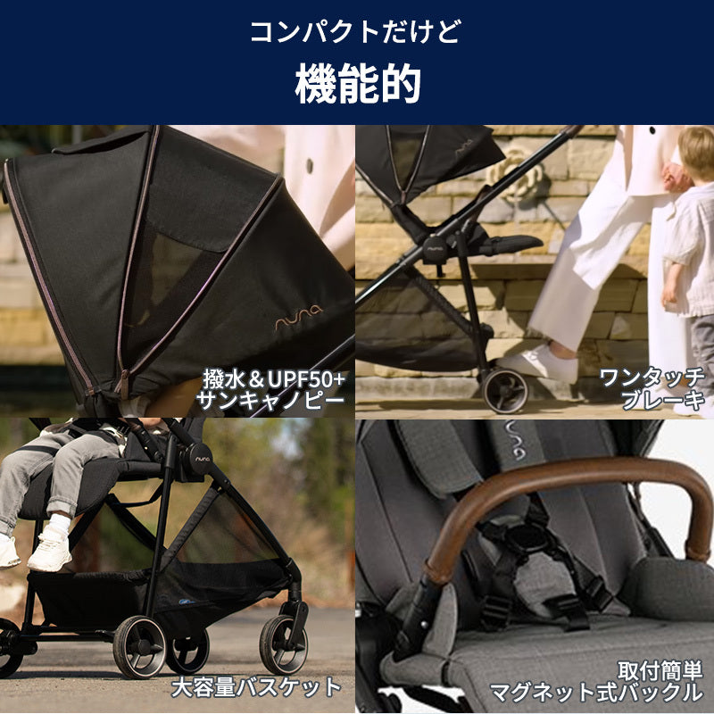 フレーム:アルミニウム,ポリプロピレン,ポリアミド シート、ホロ、収納カゴ:ポリエステル+CDP メッシュ部分:ポリエステル 折りたたみボタン/リクライニングレバー:ポリアミド+ポリアセタール タイヤ:ポリプロピレン+EVA 合成皮革:ポリウレタン+EVA 折りたたみ時の持ち手部分:ポリウレタン+ナイロン アダプター:ポリアミド+ポリプロピレン+ポリアセタール レインカバー:TPU(熱可塑性ポリウレタン |