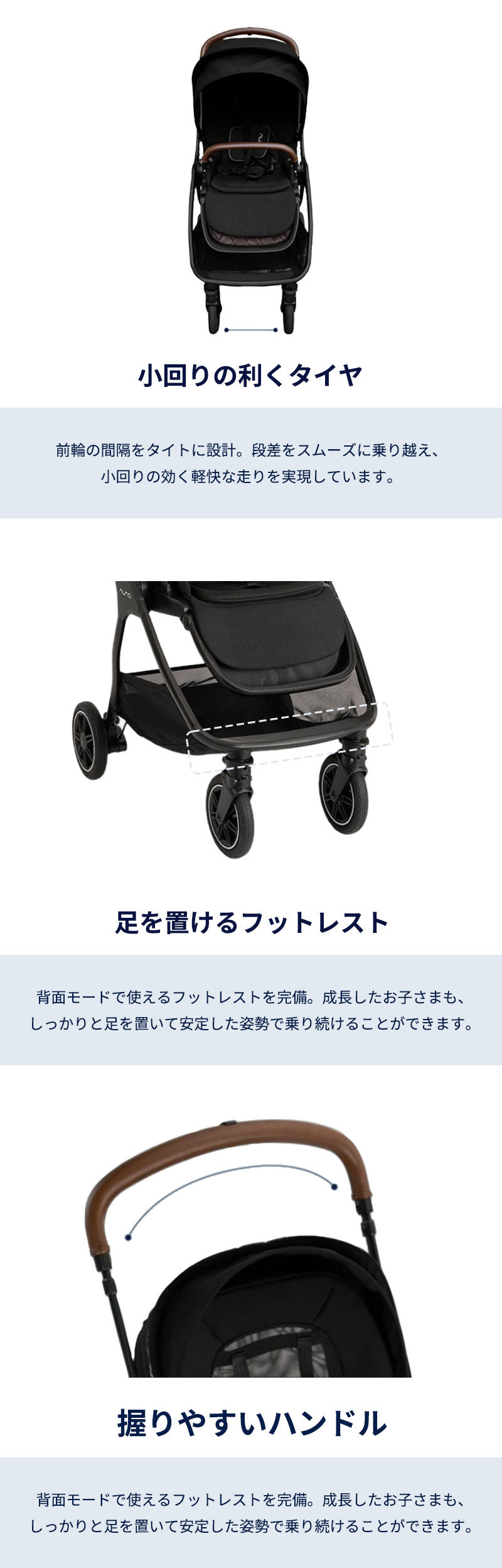 | フレーム:アルミニウム シート、ホロ:ポリエステル フットサポート:TPO(オレフィン系熱可塑性エラストマー) タイヤ:ラバー ホイール:ポリプロピレン 前輪ストッパー:ナイロン+POM 後輪ストッパー:ナイロン シートベルト:ナイロン バックル;POM 合皮:ポリウレタン+EVA プラスチックパーツ:ナイロン 収納カゴ:ポリエステル リクライニングレバー:ナイロン+POM アジャスター:ナイロン+ポリプロピレン+POM レインカバー:TPU(熱可塑性ポリウレタン) 塗装 |