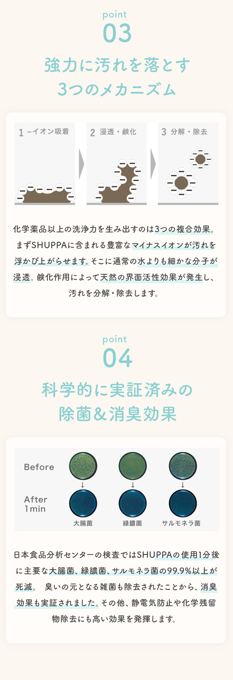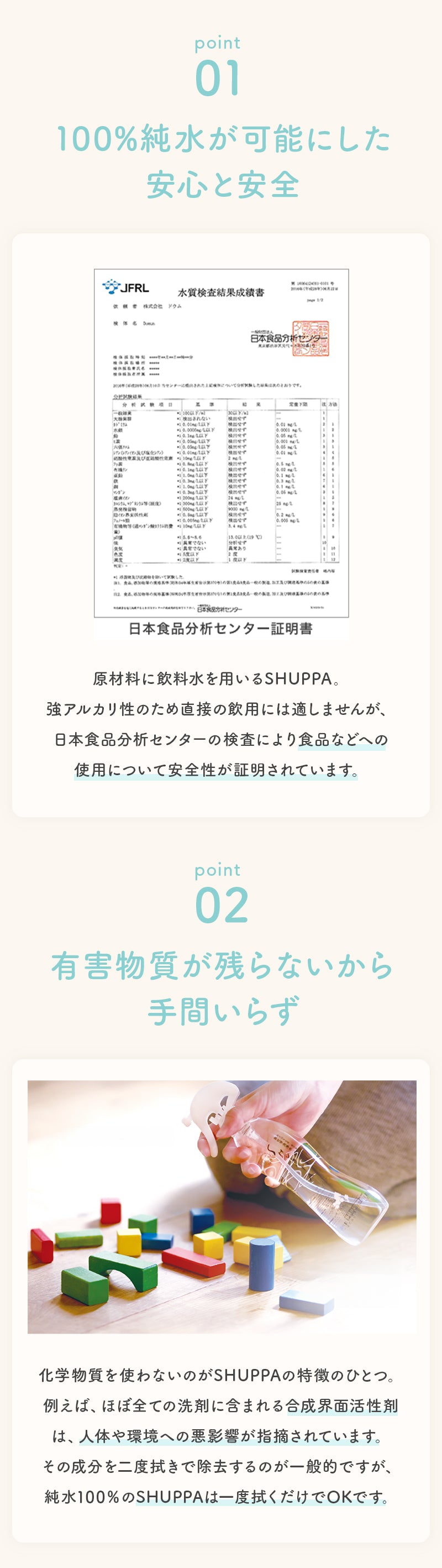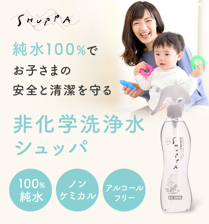 | 【科学が導き出した純水100%の洗浄力】 自然の力を大切にするDOMUNは水が持つ本来の浄化作用に着目。 最新の科学技術により100%純水のみを使用しながら、今までにない高洗浄力を持つ非化学洗浄水を開発いたしました。 【100%純水が可能にした安心と安全】 原材料に飲料水を用いるSHUPPA。 強アルカリ性のため直接の飲用には適しませんが、日本食品分析センターの検査により食品などへの使用について安全性が証明されています。 |