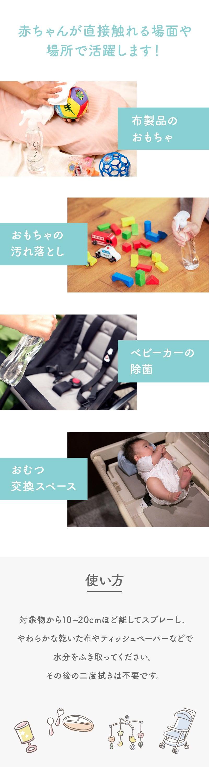 | なかなか洗うことのできない赤ちゃん用おもちゃやぬいぐるみの汚れ落としに。 子供部屋の消臭や、ベビーカーなど乳幼児が触れる身の回り場所の除菌に。 カーペットについた食べこぼしの汚れ、おむつを捨てる時のにおい消しなど。 |
