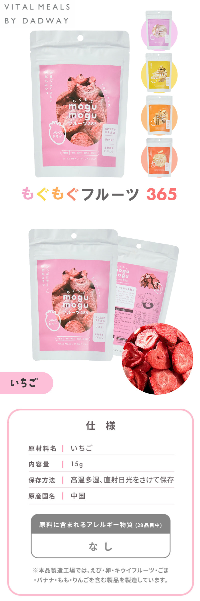 | もぐもぐフルーツ 365は果実の美味しさと栄養をそのままとじこめたフリーズドライフルーツ。 着色料や香料、保存料などを使わずに製造しておりますので安心してお召し上がりいただけます。 サクッと食感と自然な美味しさをお楽しみください。 簡単に割れるので、お子さまに与える時も喉に詰まらせることなくお召し上がりいただけます。 15グラムの大容量パックで家族でも楽しめます。 【食べ方いろいろ!】 そのままおやつに、お子さまの軽食に、ヨーグルトに混ぜて、紅茶にいれて。 〇乳児用規格適用食品 〇初めてお子さまに与える際は、アレルギーや誤嚥に気をつけ、小さく割ってください。 〇お子さまがお召し上がりの際はのどに詰まらせないよう、食べ終わるまで見守ってください。 〇果実を使用している為、色・形・味に個体差がありますが品質に問題はありません。 ※本品製造工場では、えび・卵・キウイフルーツ・ごま・バナナ・もも・リンゴを含め製品を製造しています。 対象年齢:9か月頃~ |
